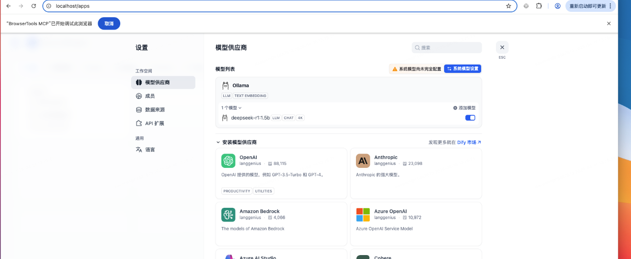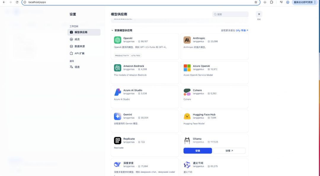 Dify 作为一款开源的大语言模型(LLM) 应用开发平台,融合了后端即服务(Backend as Service)和 LLMOps 的理念,使开发者可以快速搭建生产级的生成式 AI 应用。目前已提供了诸如聊天助手、Agent、文本生成应用、chatflow、工作流等多种类型的应用。 同样,在mac上搭建下dify的环境,首先把代码库下载下来https://github.com/langgenius/dify,然后运行下列命令就可以启动一套完整的dify环境cd dify