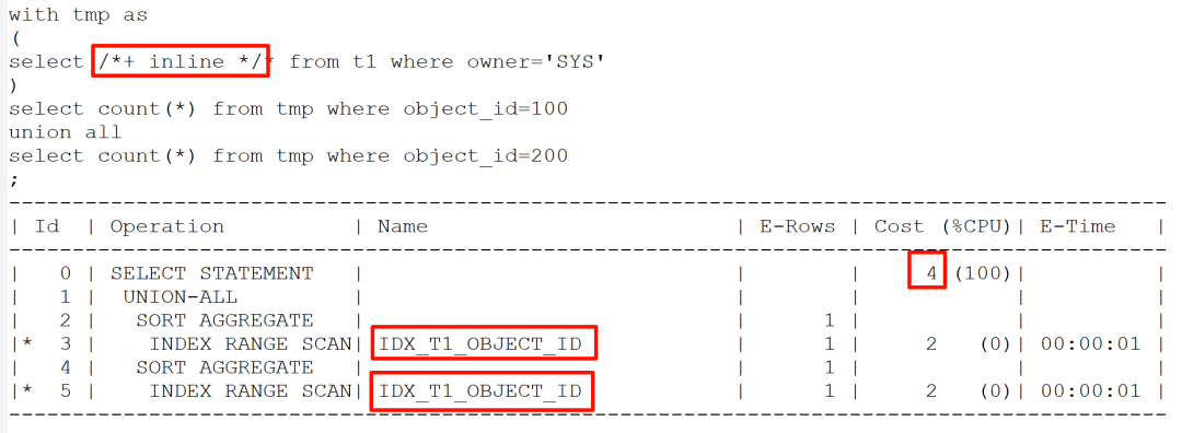 在oracle数据库中(版本19.19), 上面这个SQL的CTE写法不但起不到优化作用, 反而起到了负面作用,执行计划如下:高效的执行计划应该是下面这样的, 那个inline hint就是这个SQL的优化密码 :oracle数据库cte写法的上面表现是一个叫"_with_subquery"的隐含参数控制的, 默认值是"optimizer", 另外两个可选值分别是materialize和inline. 如果数据库中还存在下面SQL,则不管设置哪个参数, 如果不加hint,都不能让下面这个SQL与前面SQL同时高效执行, 前面那个SQL需要inline,下面这个SQL则适合materialize:with tmp as
