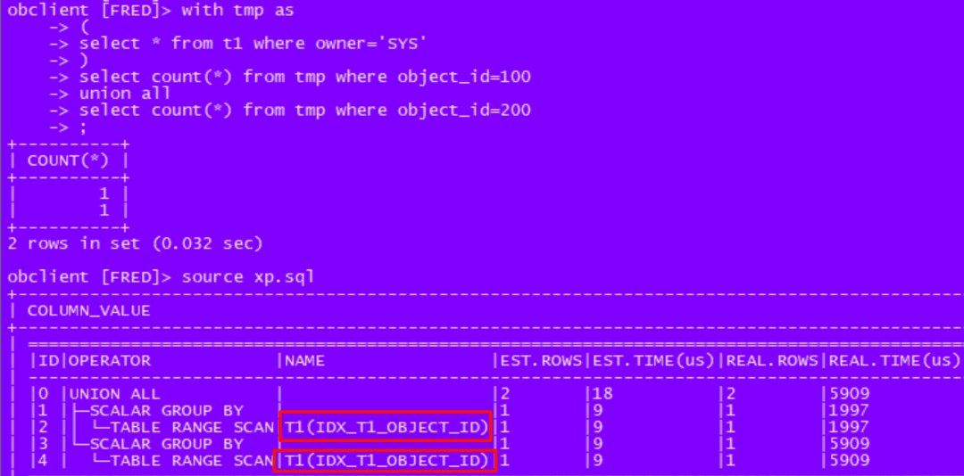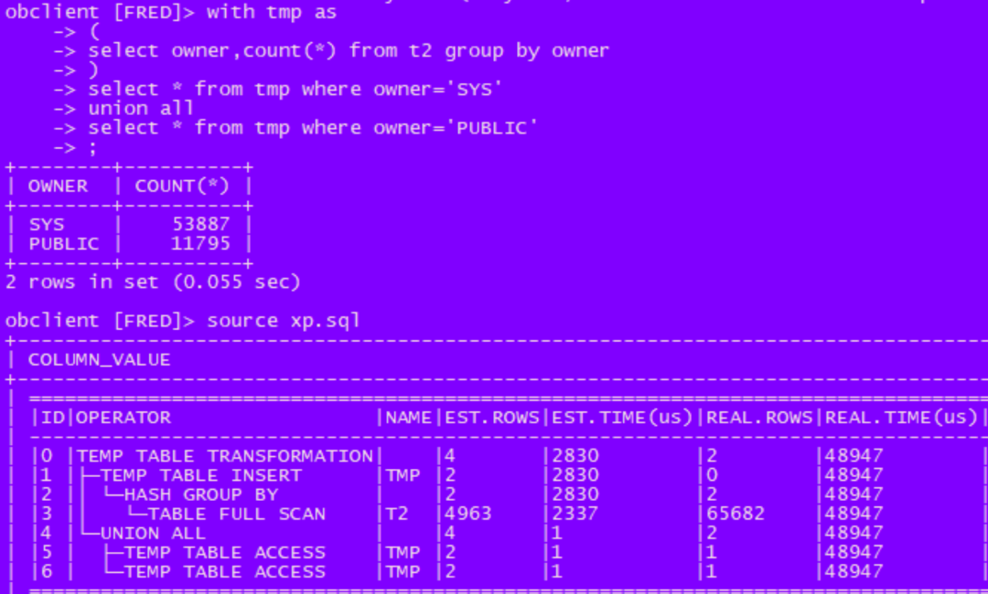 ==========================================同样的两个SQL我拿到oceanbase数据库上执行, 在默认参数情况下,都能自动生成高效执行计划:我在oracle数据库(19c)遇到很多需要改写才能高效执行的SQL, 拿到oceanbase库上执行, 不用改写也能得到高效执行计划, 看来ob优化器在查询转换方面还是花了很多心思的, 有点让我刮目相看了.之前已经有两篇相关文章介绍了oceanbase相较于oracle优化器在查询转换方面有优势的一些场景,后续还有10多个场景, ob表现也都比oracle优秀, 有时间我会慢慢写出来.