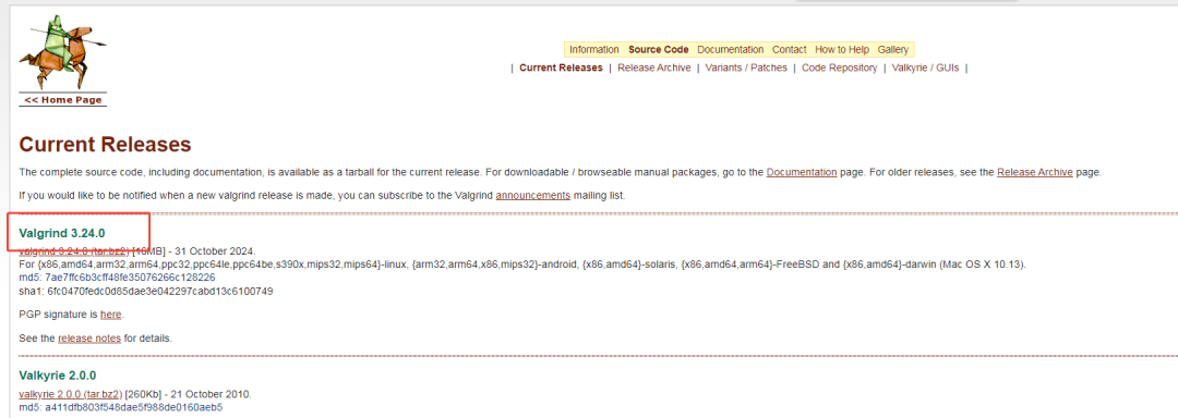 3)下载当前最新版本,点击"valgrind-3.24.0.tar.bz2"即可下载