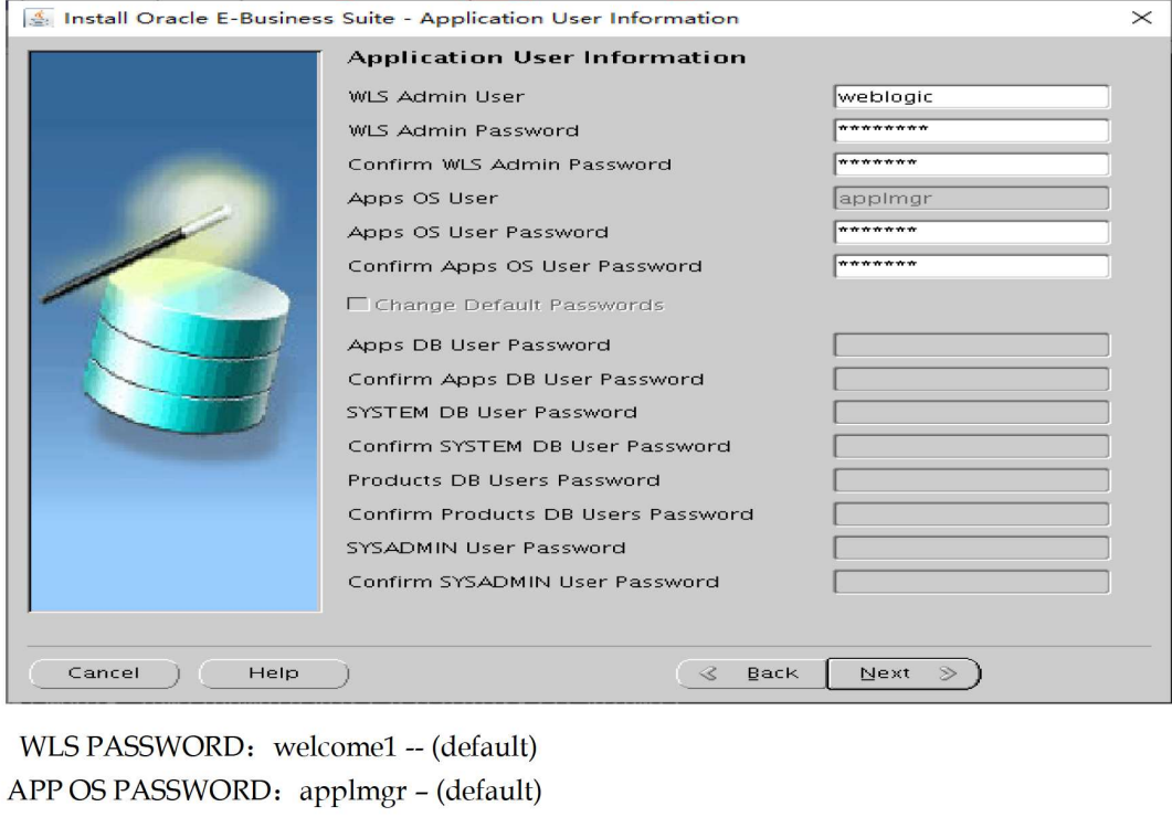 注意:安装完成后,所有关键密码都是默认状态,如以下显示的关键账号。以下账号如果出问题,整个系统将会崩溃。短时间内导致系统无法使用。请重视以下账号及密码的保存。同时不能更改账号名。应用和数据库交互的核心账户apps用户,无论是启动服务还是补丁应用均要用到该用户。但该用户的底层用户是applsys用户: