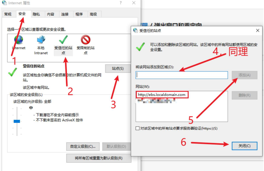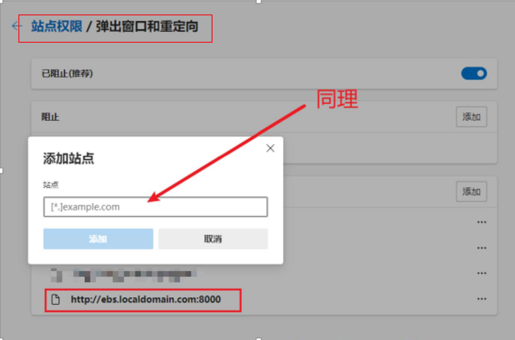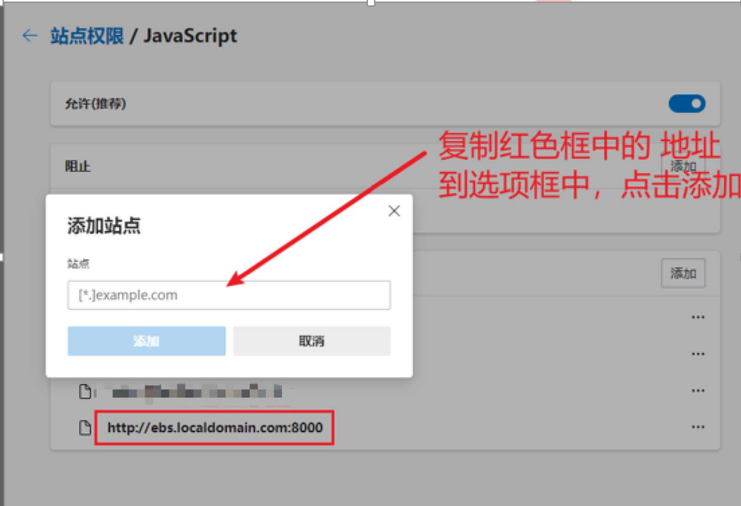 浏览器进入设置 --> 进入 Cookie和网站权限 --> 选择JavaScript :输入http://ebslocaldomain.com:8000 --> 选择弹出窗口和重定向 :输入 http://ebslocaldomain.com:8000