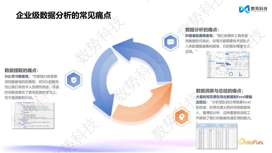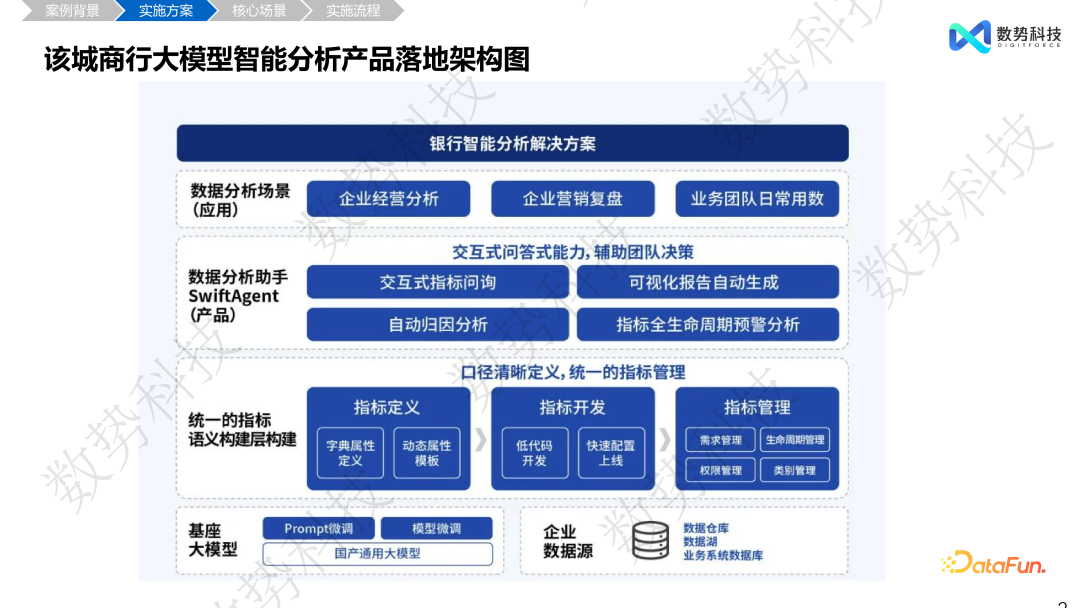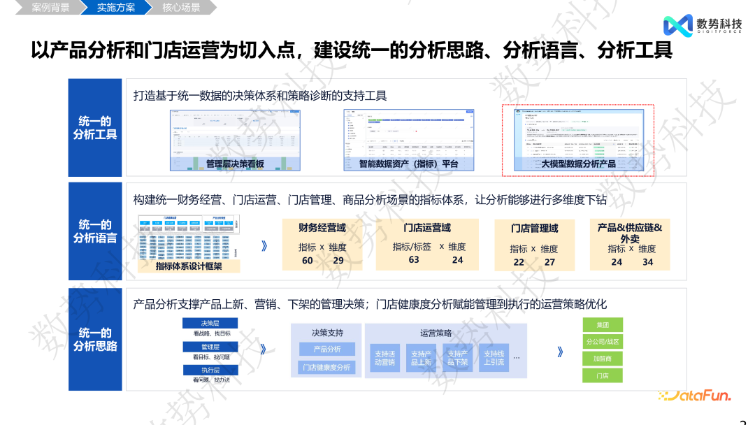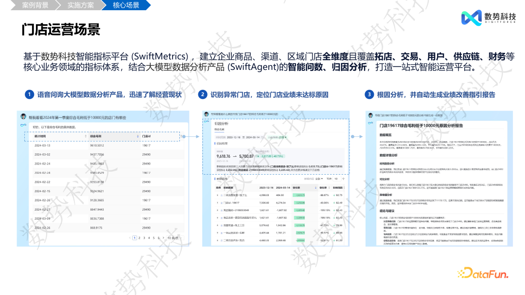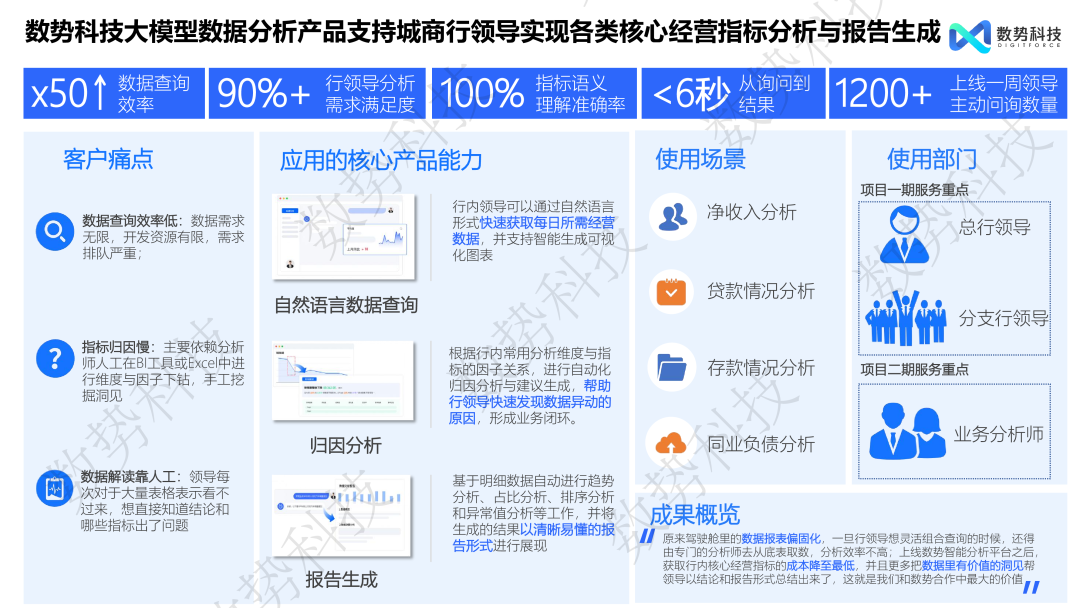 某头部城商行在数据分析方面面临诸多痛点。数据查询效率低,数据需求无限而开发资源有限,导致需求排队严重;指标归因慢,主要依赖分析师人工在 BI 工具或 Excel 中进行维度与因子下钻,手工挖掘洞见,效率低下;数据解读靠人工,领导面对大量表格难以快速获取结论,想直接知道哪些指标出了问题。针对这些痛点,数势科技为其打造了企业级数据分析助手。该助手上线后,取得了显著成效。满足了领导们关于净收入分析、贷款存款、同业负债等核心指标的查询场景,领导群体大概有几十人,累计 1200 条查询需求,从问询到结果输出基本能在 5 秒之内完成,经分析,他们提出的问题中 90% 以上都能通过该助手满足并实现。在项目实施过程中,首先面临需求错配问题,总行分析师仅有大概 20 人,但有上千号业务人员和领导有日常取数需求,通过优化流程和技术手段提升团队效率。其次,解决指标语义口径定义混乱的问题,通过构建语义层,统一指标定义和口径。整体架构如上图所示,基于企业数据源和基座大模型,构建统一的指标语义层,并在此基础上提供交互式的数据分析助手。在场景应用方面,初期围绕分支行业绩对比这个场景进行实施和输出,让领导们先使用起来。第二期针对业务团队,如对公贷款团队、零售客户信用卡分析团队等,满足他们通过自然语言进行详细分析和深入挖掘的需求,并进行了相应实施。以银行业客户逾期情况数据查询场景为例,SwiftAgent 中有预制好的问题模板和定义好的指标,通过大模型将自然语言解析成指标和标签语义,避免了自然语言直接生成 SQL 导致的数据查询准确率低的问题。用户可以查询特定时间段内逾期客户占比和逾期客户数,并进行可视化趋势分析,还能对逾期客户进行不同维度的归因分析,如具体到某时间段内逾期客户占比的变化趋势,通过因子分析找出影响因素,对相关维度进行下分分析,查看不同行业、省份客户量的变化情况,最后生成完整的解读报告,包括整体的指标变化情况、影响的因子和维度有哪些,并将具体的情况以鱼骨图展示。同时,基于丰富的行业经验,帮助客户建立完整的指标体系,每个指标都保证口径统一,方便用户查询指标的基础信息,通过计算血缘关系清晰展示指标的数据来源,实现数据的追踪溯源,确保准确。用户也可以通过移动端,在任何场景都能以自然语言的形式进行数据查询、数据归因分析以及报告查询等功能。2. 某头部门店连锁企业智能数据分析产品应用案例