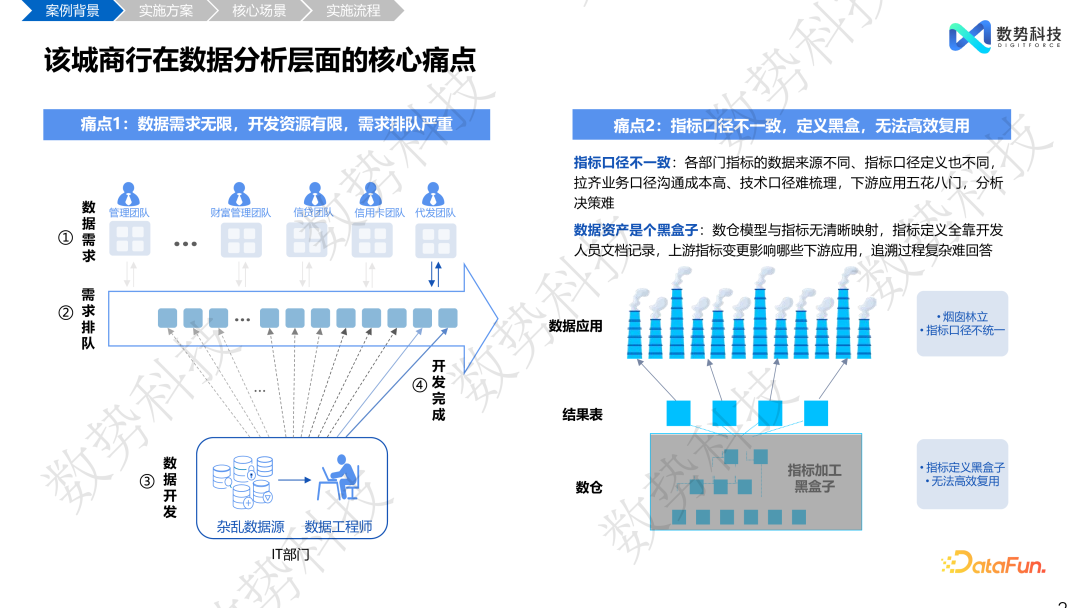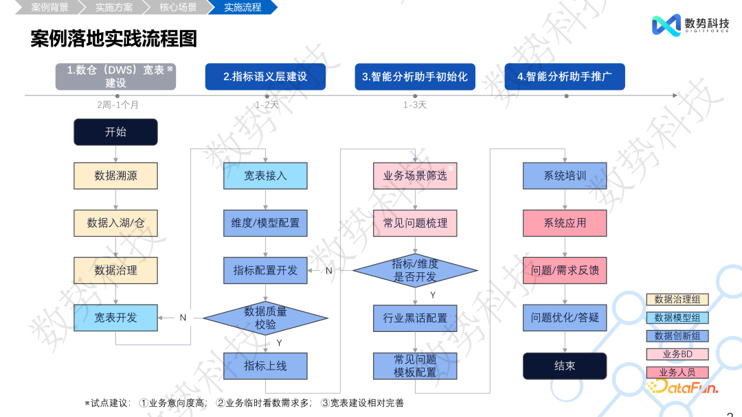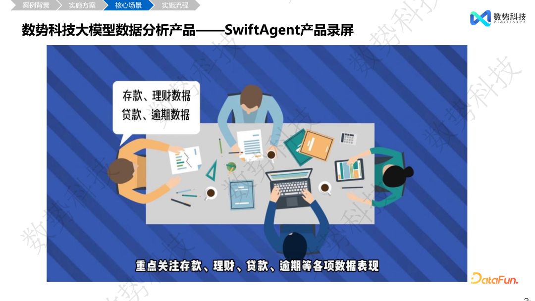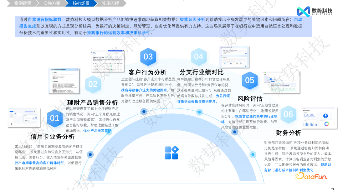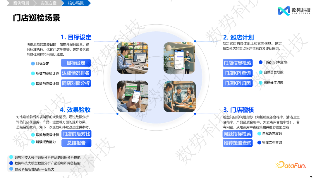 某头部城商行在数据分析方面面临诸多痛点。数据查询效率低,数据需求无限而开发资源有限,导致需求排队严重;指标归因慢,主要依赖分析师人工在 BI 工具或 Excel 中进行维度与因子下钻,手工挖掘洞见,效率低下;数据解读靠人工,领导面对大量表格难以快速获取结论,想直接知道哪些指标出了问题。针对这些痛点,数势科技为其打造了企业级数据分析助手。该助手上线后,取得了显著成效。满足了领导们关于净收入分析、贷款存款、同业负债等核心指标的查询场景,领导群体大概有几十人,累计 1200 条查询需求,从问询到结果输出基本能在 5 秒之内完成,经分析,他们提出的问题中 90% 以上都能通过该助手满足并实现。在项目实施过程中,首先面临需求错配问题,总行分析师仅有大概 20 人,但有上千号业务人员和领导有日常取数需求,通过优化流程和技术手段提升团队效率。其次,解决指标语义口径定义混乱的问题,通过构建语义层,统一指标定义和口径。整体架构如上图所示,基于企业数据源和基座大模型,构建统一的指标语义层,并在此基础上提供交互式的数据分析助手。在场景应用方面,初期围绕分支行业绩对比这个场景进行实施和输出,让领导们先使用起来。第二期针对业务团队,如对公贷款团队、零售客户信用卡分析团队等,满足他们通过自然语言进行详细分析和深入挖掘的需求,并进行了相应实施。以银行业客户逾期情况数据查询场景为例,SwiftAgent 中有预制好的问题模板和定义好的指标,通过大模型将自然语言解析成指标和标签语义,避免了自然语言直接生成 SQL 导致的数据查询准确率低的问题。用户可以查询特定时间段内逾期客户占比和逾期客户数,并进行可视化趋势分析,还能对逾期客户进行不同维度的归因分析,如具体到某时间段内逾期客户占比的变化趋势,通过因子分析找出影响因素,对相关维度进行下分分析,查看不同行业、省份客户量的变化情况,最后生成完整的解读报告,包括整体的指标变化情况、影响的因子和维度有哪些,并将具体的情况以鱼骨图展示。同时,基于丰富的行业经验,帮助客户建立完整的指标体系,每个指标都保证口径统一,方便用户查询指标的基础信息,通过计算血缘关系清晰展示指标的数据来源,实现数据的追踪溯源,确保准确。用户也可以通过移动端,在任何场景都能以自然语言的形式进行数据查询、数据归因分析以及报告查询等功能。2. 某头部门店连锁企业智能数据分析产品应用案例