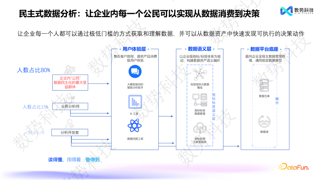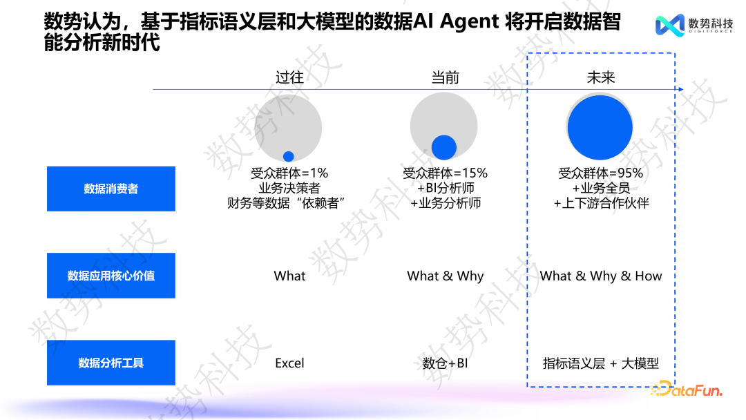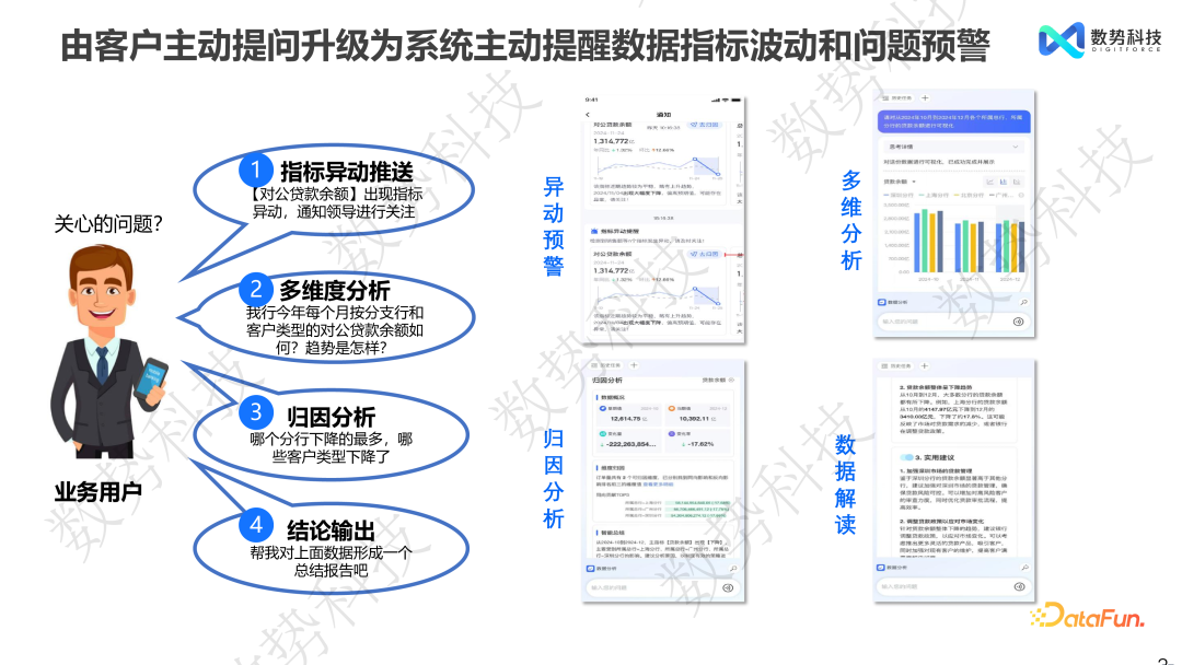 在为客户服务的过程中,我们发现当前 Data Agent 或其他 Agent 工具大多是用户主动提问的模式,这对用户的提问能力有一定要求,且在实际使用中,业务用户,尤其是领导,不太清楚针对企业指标该如何提问。为此,我们进行了一项优化,除了让用户主动对企业内部指标体系或分析体系提问外,还让系统主动帮助用户发现问题。例如,之前服务的一家银行有两千个指标,对于业务方或领导而言,很难每天清楚该关注哪个指标、哪个维度。所以,我们让系统先从两千个指标中分析出可能存在问题的指标,例如告知领导对公贷款的某个指标近期下降了 10% 或 5%,提醒领导关注,这是第一步;接着,大模型基于这个问题生成相关问题,比如建议领导从分支行、业务部门或业务线等视角查看;领导基于这些推荐问题深入洞察,要求工具从特定视角进行归因分析,进而进入多维取数、归因分析等后续步骤,最后以报告形式呈现给领导。在未来发展过程中,我们认为系统本身可以主动为用户生成问题、发出指标预警。这种方式既可以提升系统的交互体验,又可以降低用户主动思考问题的难度,能让工具更好地服务企业,提高企业数据分析的消费效率。例如,系统可以实时监测数据指标波动,当发现 “对公贷款余额” 出现指标异动时,及时通知领导进行关注,并进一步提供多维度分析、归因分析,帮助领导快速了解情况,做出决策。本次分享围绕企业数据分析的痛点、技术路线、产品设计、实践案例以及未来发展方向,对数科科技在零售和金融行业的 Data Agent 解决方案进行了深入剖析。通过构建指标语义层、采用多 Agent 协作架构以及引入大模型能力,Data Agent 为企业提供了高效、智能的数据分析服务。未来,随着技术的不断进步,Data Agent 将朝着主动式、智能化方向发展,为企业创造更大的价值。岑润哲,现任数势科技数据智能产品总经理,前头部互联网公司资深量化运营负责人,多年零售与金融行业数据挖掘与用户运营策略设计经验,曾为多家大型企业搭建从目标设定、数据诊断、策略设计到优化复盘的全链路数字化运营平台。