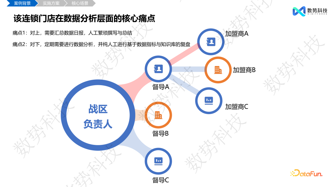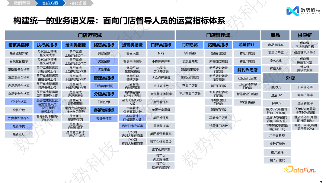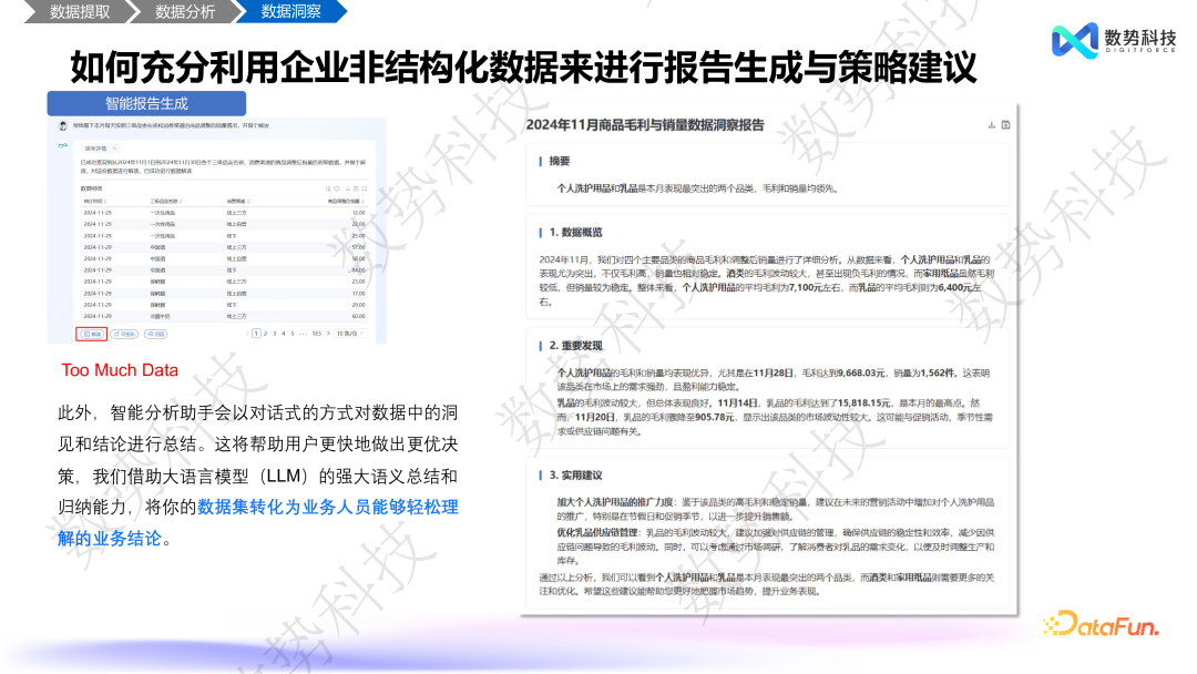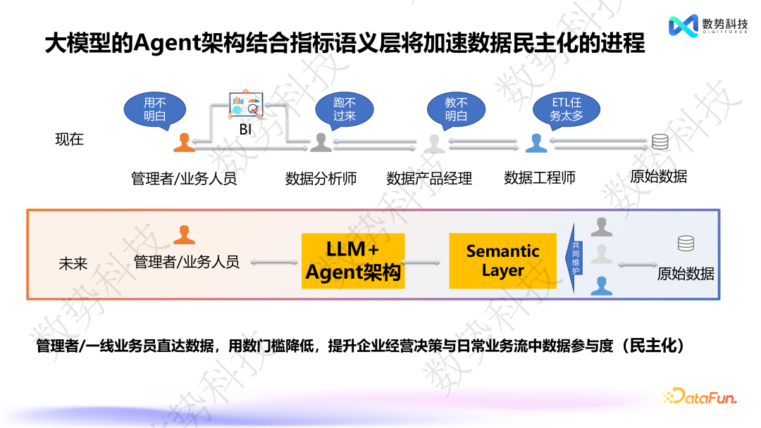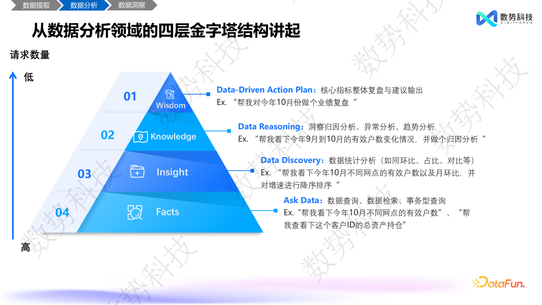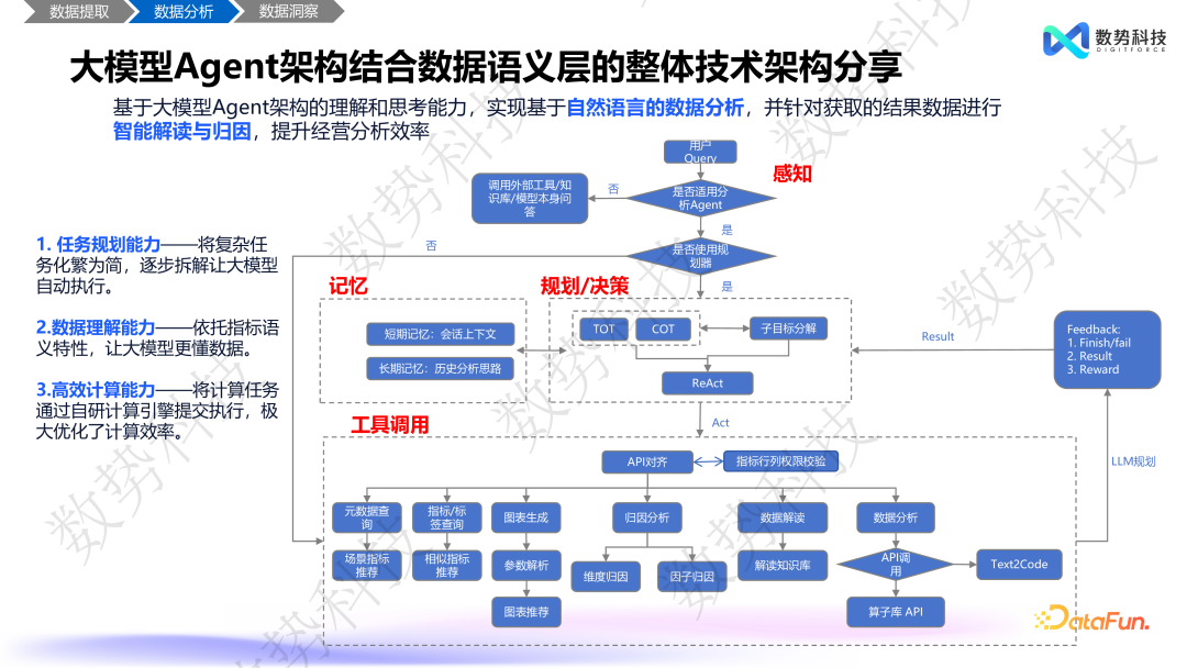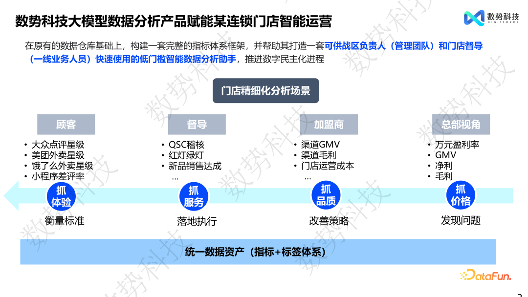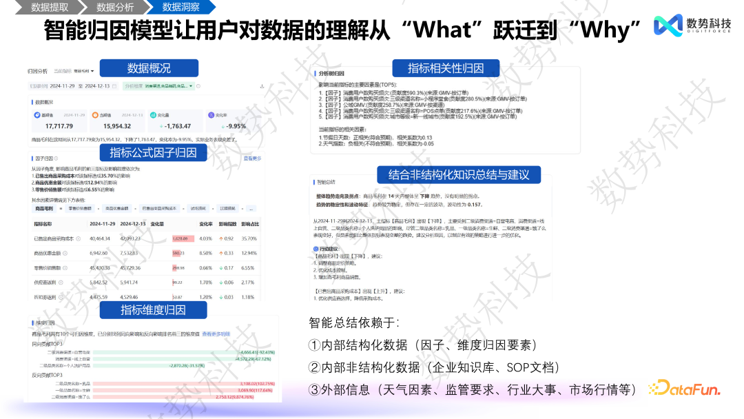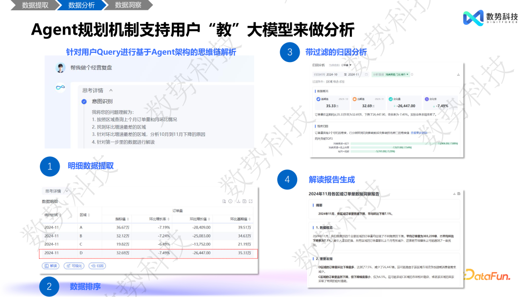 在原有数据仓库的基础上,数势科技利用自身的大模型数据分析产品帮助其构建了一套完整的指标体系框架,并打造了一套供管理团队和门店一线业务人员使用的数据分析助手。连锁门店的核心痛点在于,对上,需要汇总数据日报,人工繁琐撰写与总结;对下,定期需要进行数据分析,并纯人工进行基于数据指标与知识库的复盘。每个督导人员平均管理四十家门店,且每个门店表现各异,导致报告难以个性化撰写。数势科技为其打造的产品旨在通过产品帮助这些门店加盟商的督导实现更智能化的门店运营分析。项目主要分为几个阶段:第一个阶段是整合语义层,为了让大模型更好地理解指标体系,前期提供资源服务,梳理了财务域、门店域、商品域以及供应链的一些指标,构建了体系化的指标框架;第二个阶段,基于构建好的指标体系,借助大模型助手助力用户理解门店的业绩表现。以门店管理域和门店运营域的指标体系为例,构建完成后,让大模型理解这套体系。一线门店的店长或管理人员在日常工作中可以进行多项操作:首先,可以进行目标分析和同店对照分析,查看自己管理的门店业绩考核 KPI 是否达标,哪些门店表现不佳;还能结合知识库,查询门店地址等信息,并对 KPI 未达成的原因进行深度分析,也就是归因能力;此外,针对不同的问题指标,还能为加盟商提供建议。比如产品品质合格率不高时,系统不仅能告知加盟商合格率存在问题,还能从 ABC 三个视角给出下个月的优化方向。这就实现了从数据分析到输出行动方案的连接,而不是仅仅给加盟商一个 Excel 表。例如,店长想了解门店毛利较低的原因,首先会进行数据提取,得到明细表;然后拿着明细表询问大模型毛利出现问题的原因,通过归因分析能力,判断可能是某个商品成本出现问题导致毛利波动;最后,基于这些根因分析结论,为店长或加盟商的督导输出完整报告,明确指出问题所在,并给出后续优化策略调整建议,帮助提升门店经营水平。发展方向展望:大模型 Agent + 数据分析未来发展方向