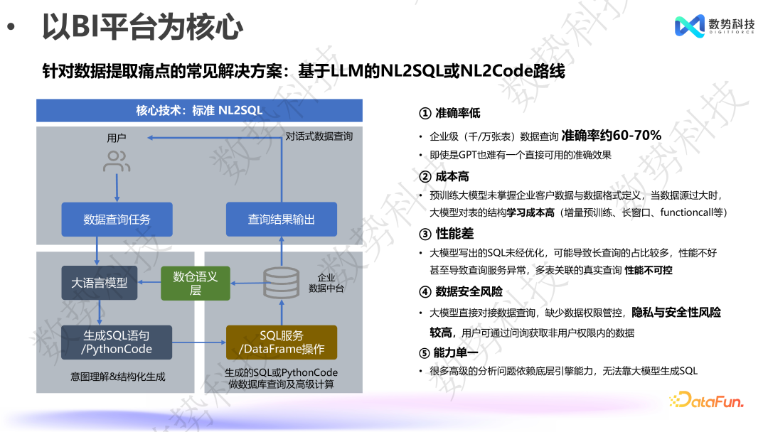 从技术角度来看,实现大模型与数据分析结合主要有三条路径,分别是自然语言转 SQL(NL2SQL)、自然语言转 Python 代码(NL2Code),以及自然语言转语义层(NL2Semantics)。这三条路径在实现方式、优缺点等方面存在差异。1. 以 BI 平台为核心的 NL2SQL 或 NL2Code 路线