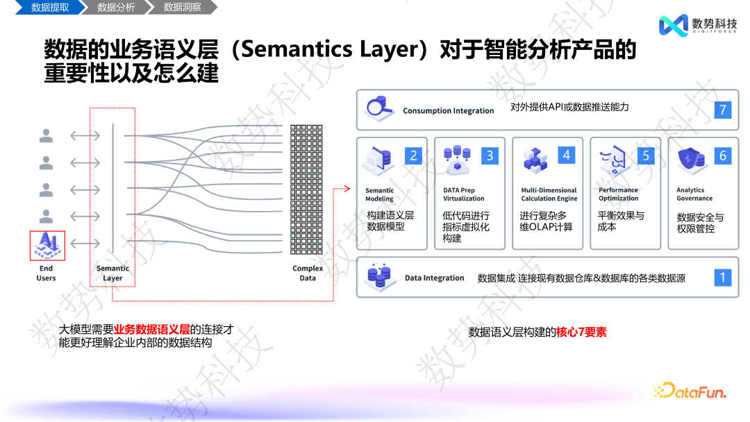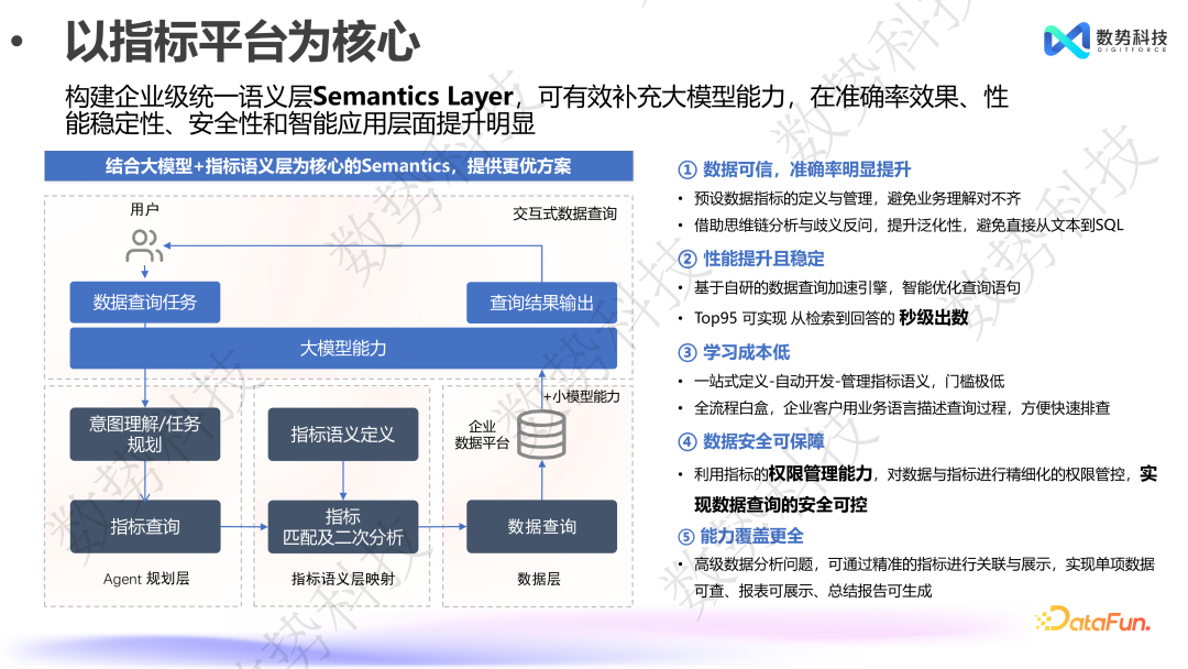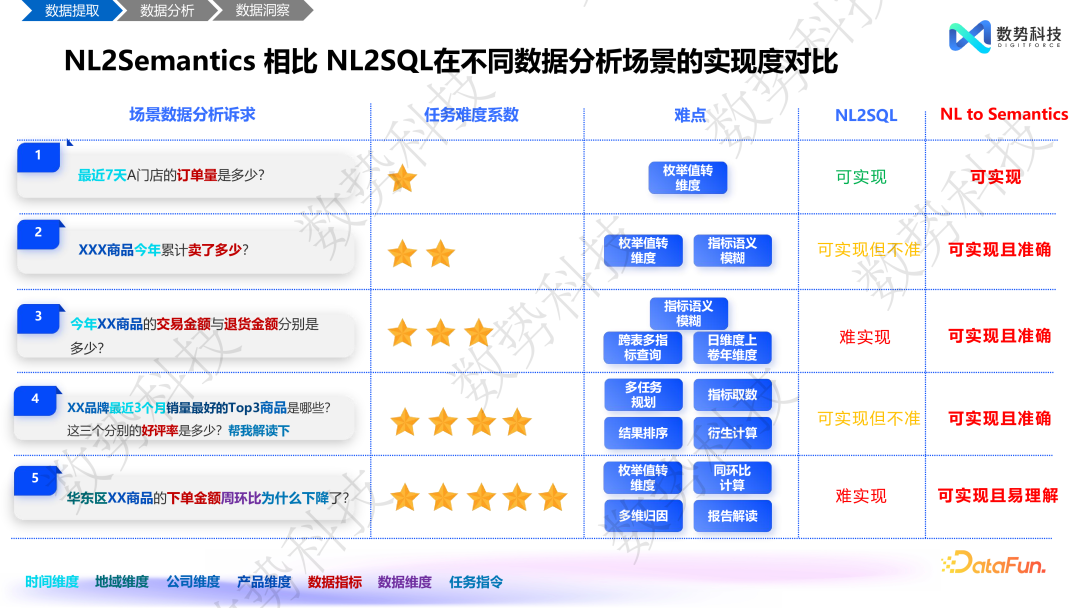 鉴于 NL2SQL 或 NL2Code 的弊端,我们提出在大模型和底层数据仓库之间加入一层语义层。构建语义层的原因在于底层数据库逻辑复杂,大模型难以直接理解,而语义层可以像桥梁和翻译器一样,将复杂的数据库逻辑与指标维度进行映射,使大模型能将用户需求转化为相关分析范式。这种方式具有诸多优势。查询的指标可信,进行财务分析时,能确保成本、利润、收入等指标与企业标准指标一致。计算过程中有预聚合操作,可保证前端查询的效率和时效性。每个指标都能进行严格的行列级管控,例如根据用户角色对上海和北京用户关于销售额的查询进行指标级过滤,更精准地提取数据。在处理复杂问题时,先构建好指标语义层,再借助大模型和 Agent 架构解析复杂任务意图,这种技术路线对于不同类型问题的处理能力更强,能够满足企业内部不同角色在不同场景下的复杂任务需求。构建数据语义层需要具备七个要素,包括明确语义模型,界定哪些字段是指标、哪些是维度;针对底层指标,判断是否需要进行多维 OLAP 计算以提高查询效率等。当这些能力具备后,语义层即可成为连接用户自然语言和底层数据库数据语言的重要连接器。以用户提问 “帮我看一下最近七天的销售额,并且做一个趋势分析,以及帮我做一个解读” 为例,大模型首先进行任务规划,将该问题拆解为取数、趋势分析和解读等子任务。然后,大模型将每个子任务涉及的指标或维度在语义层进行映射,由于语义层中每个指标和维度都有标准定义,此时大模型并非直接生成 SQL 逻辑,而是进行 SQL 片段的召回和拼接,从而大幅提高准确率。接着,将任务交给 OLAP 引擎执行,得到结果明细表。对于时间序列数据,借助小模型进行趋势分析或预测。最终,将结果以自然语言报告或摘要的形式呈现给用户。通过对比 NL2SQL 和 NL2Semantics 在不同数据分析场景的实现度可以发现,在简单查询场景中,两者都可实现,但 NL2Semantics 更准确;在复杂查询场景,如跨表多指标查询、多维归因和报告解读等,NL2SQL 难实现或实现效果不佳,而 NL2Semantics 不仅可实现,且结果准确、易于理解。我们可以将数据分析的需求分为四类,其中最基础的数据查询的需求是数量最多的,但价值相对较低;在查询基础上进行统计分析,进而洞察深层原因,甚至给出决策建议才是更有价值的工作。我们采用 Agent 架构实现复杂意图的识别。首先对用户 Query 进行拆解,之后将不同的子任务与不同的 API 对齐,进行 workflow 的编排。以某线下零售行业客户的场景为例,用户提出“帮我做个经营复盘”,如果将问题直接提给大模型,大模型并不会根据企业自身的数据进行分析。以 Agent 架构实现,即可沉淀企业内部分析师的分析思路。这时该问题就会被拆解成四个任务,首先是提取明细数据,即按区域查询上月订单量和月环比情况;接着进行排序,找到最差的区域;第三步归因分析,找到环比下降的原因;最后将结果给到大模型,生成报告。在数据洞察中,还可以结合非结构化数据和外部信息,更好地进行归因分析。将通过自然语言获取到的数据集变为易于理解的结论和建议,对业务方而言才更有意义。企业级 Data Agent 产品设计思路