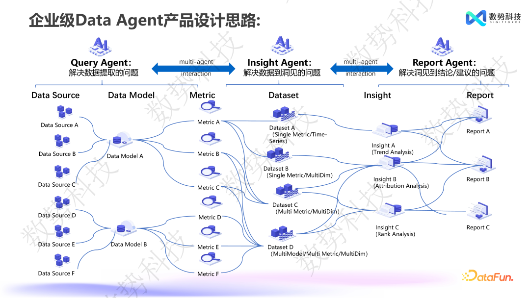 基于上述技术路线的分析,我们提出企业级 Data Agent 产品设计思路,其中包含 Query Agent、Insight Agent 和 Report Agent,它们相互协作,共同实现数据从提取到洞察再到报告生成的全流程处理。1. Query Agent