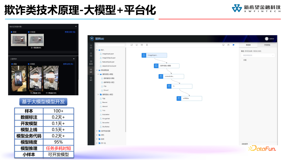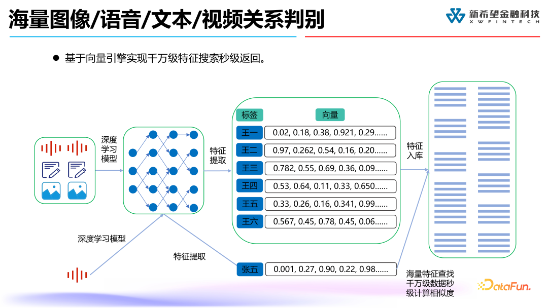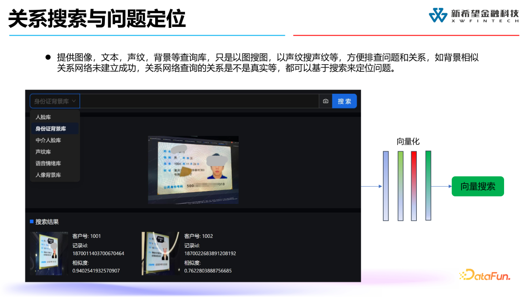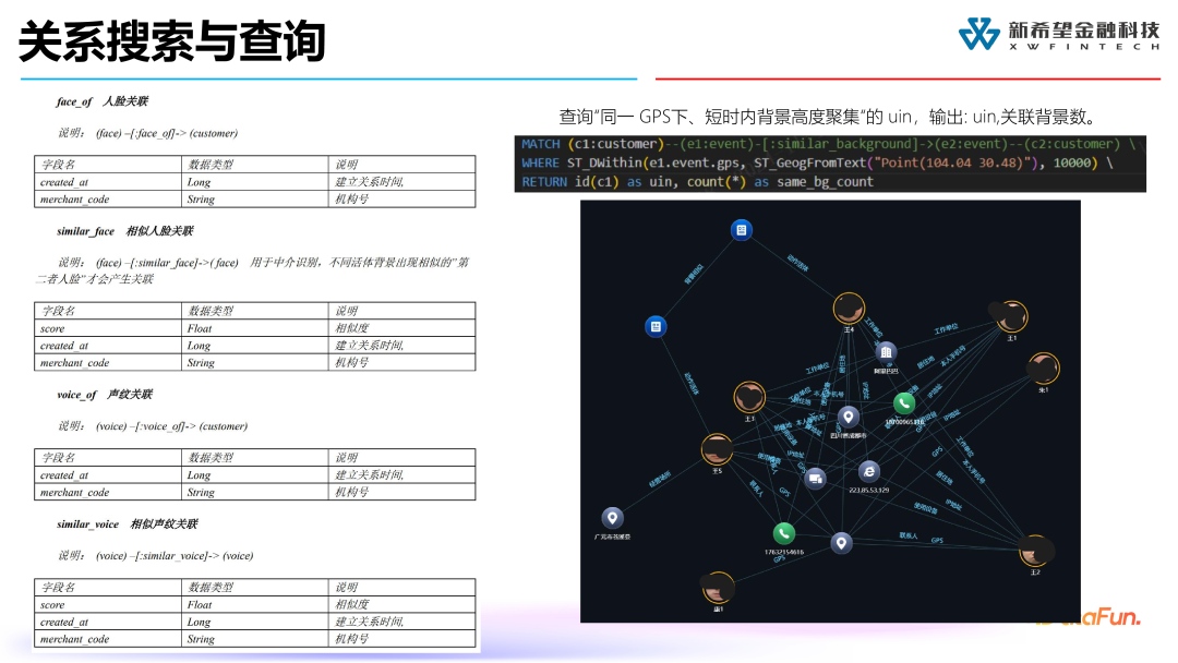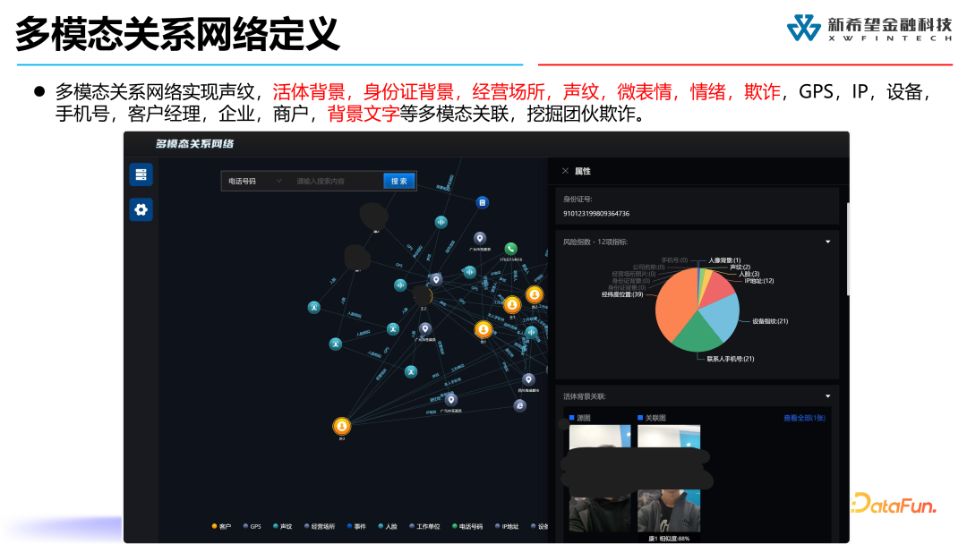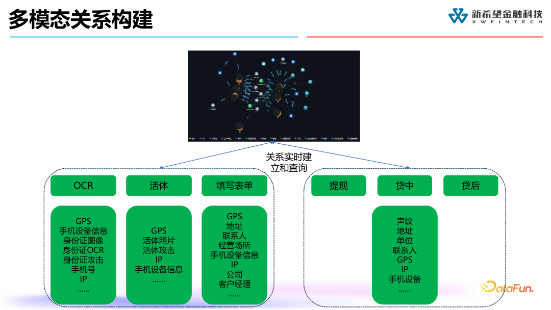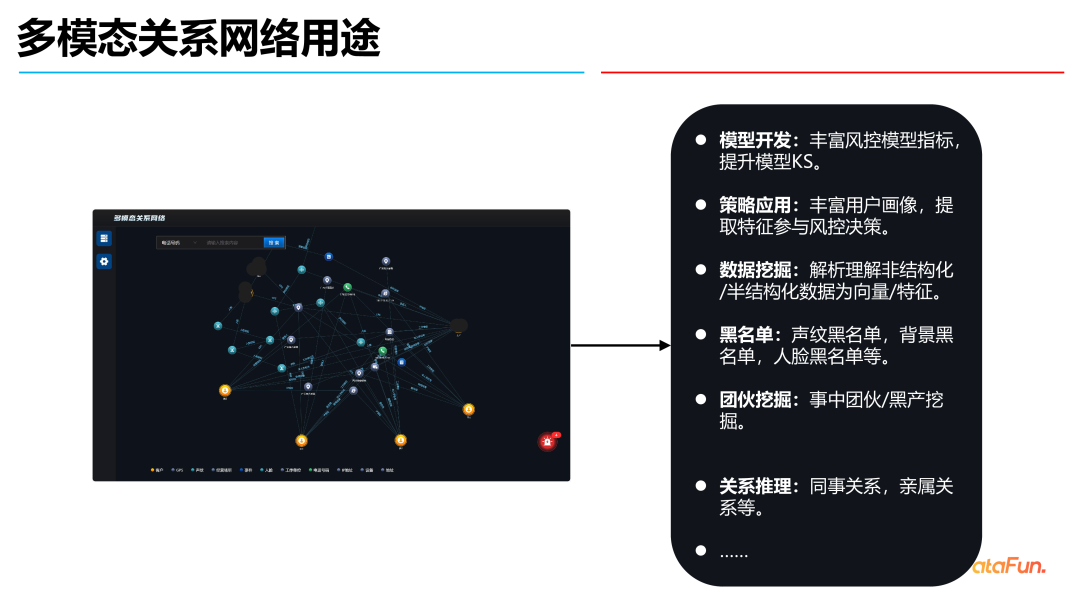 模型开发:多模态关系网络中的关联特征可以丰富风控模型指标,提升模型 KS。 策略应用:丰富用户画像,提取特征参与风控决策。比如背景的关联,同一个 GPS 下出现了短期内一个背景的高度聚集,这种情况一般都是黑产或中介攻击,可以直接拒绝。 数据挖掘:解析理解非结构化/半结构化数据为向量/特征。 黑名单:包括声纹黑名单、背景黑名单、人脸黑名单等。 团伙挖掘:可以在事中进行团伙/黑产挖掘。比如短时间内,同 1 个 GPS 下同一个背景出现了5次,就可以把它定义成一个团伙,去做事中处理。 关系推理:包括同事关系、亲属关系等。