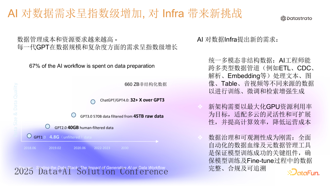 随着 ChatGPT 等生成式 AI 技术的兴起,人工智能(AI)的发展进入了一个新的阶段。AI 模型的训练需要大量的数据,包括文本、图像、音视频等多种类型。这使得企业对数据的需求呈指数级增长,尤其是非结构化数据的管理和治理成为新的挑战。1. AI 对数据需求呈指数级增加