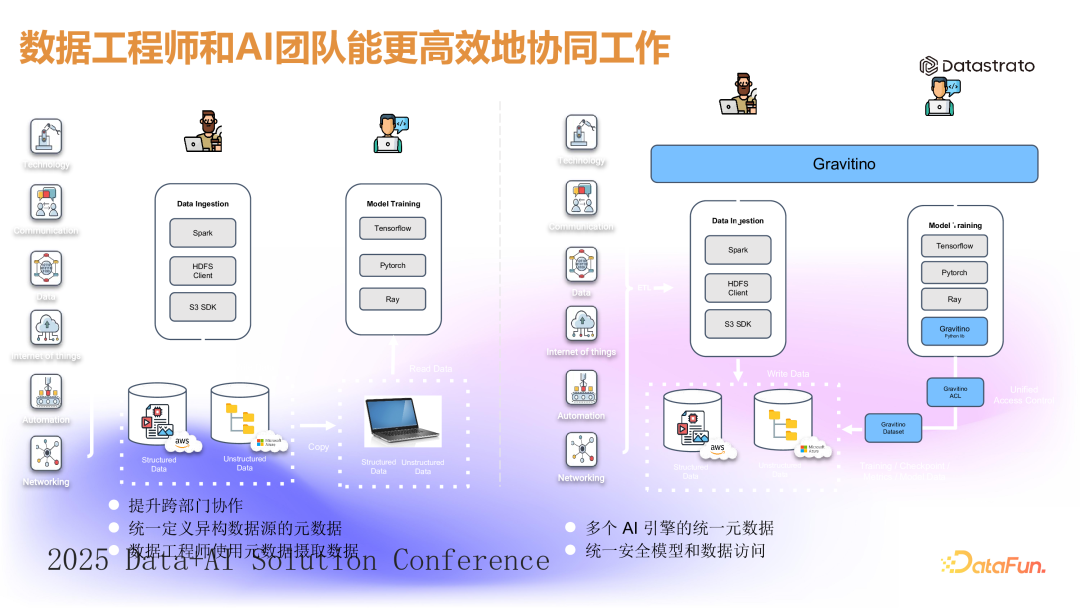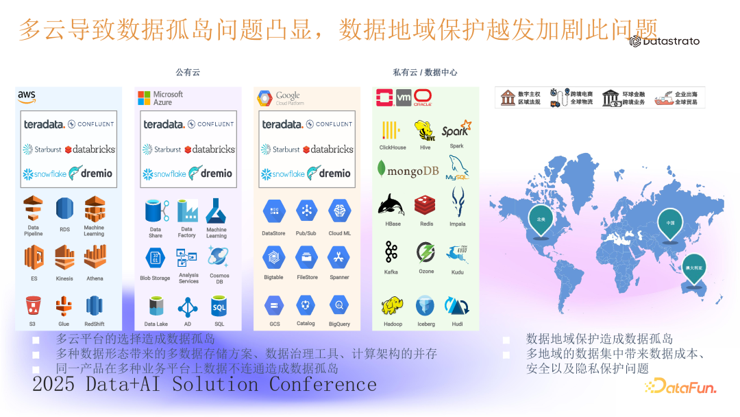 大家知道,训练高质量的大语言模型需要大量高质量的数据作为前提。如果缺乏准确、高质量的数据,训练出来的模型可能会存在缺陷,导致资源和算力的浪费,甚至产生法律纠纷等问题。因此,数据质量、实时性、安全管控、利用率和资源占用等方面都需要一套完整的数据管理手段。3. 多云导致数据孤岛问题进一步凸显