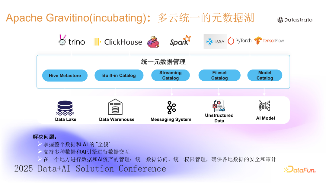 Gravitino 为结构化和非结构化数据提供了统一的访问途径。用户只需与 Gravitino 交互,即可获取必要的元信息来操作数据。对于结构化数据,Gravitino 支持多引擎多种数据源的操作;对于非结构化数据,则提供了一个虚拟文件系统(gvfs),允许用户仅通过逻辑名称完成数据访问,屏蔽了底层物理存储细节。5. 统一元数据管理