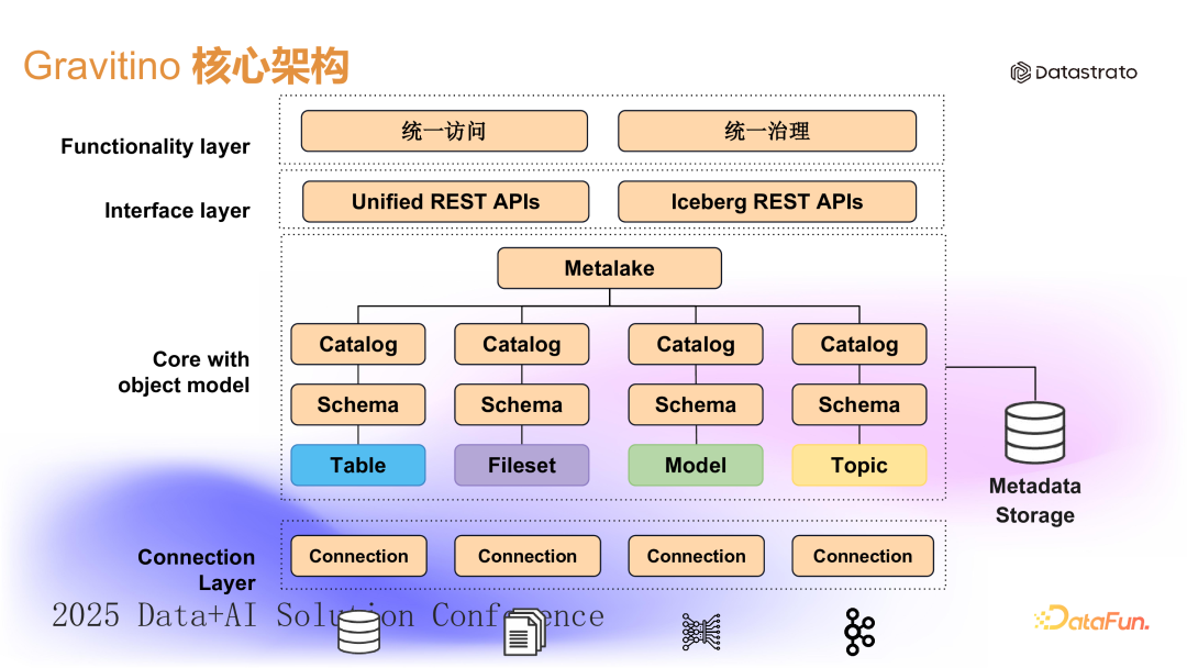 然而我们能看到、接触到的数据,往往只是所有数据的一小部分;在可见的数据之下,隐藏着诸多重要的元信息,例如数据来源、版权、主权、分类分级、保留期限等方面。这些元信息对于有效的数据管理和治理至关重要。如果缺失了这些关键元信息,数据变得难以发现、管理和使用,甚至会引发用户的担忧或监管机构的质疑。Apache Gravitino 整体架构设计