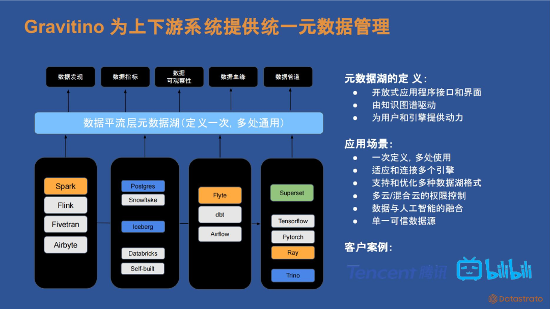 这家家电企业在国内外市场均有业务,并意识到传统技术体系中缺乏对非结构化数据的有效治理,尤其是在 AI 发展的背景下,这一问题愈加突出。具体挑战包括:(1)数据治理缺口:传统的技术体系能够很好地管理结构化数据,但对于非结构化数据则显得力不从心。(2)内部协作障碍:不同部门之间存在信息孤岛现象,阻碍了数据共享和协同工作。(1)结构化与非结构化结合:利用 Gravitino 管理结构化和非结构化数据,使非结构化数据能够被类似结构化的方式处理,即标签化和坐标化。(2)生态衔接:对接分布式文件系统、权限鉴权机制以及 Python 生态,确保不同系统间的良好衔接。3. 案例 3:互联网 IT 行业客户:哔哩哔哩