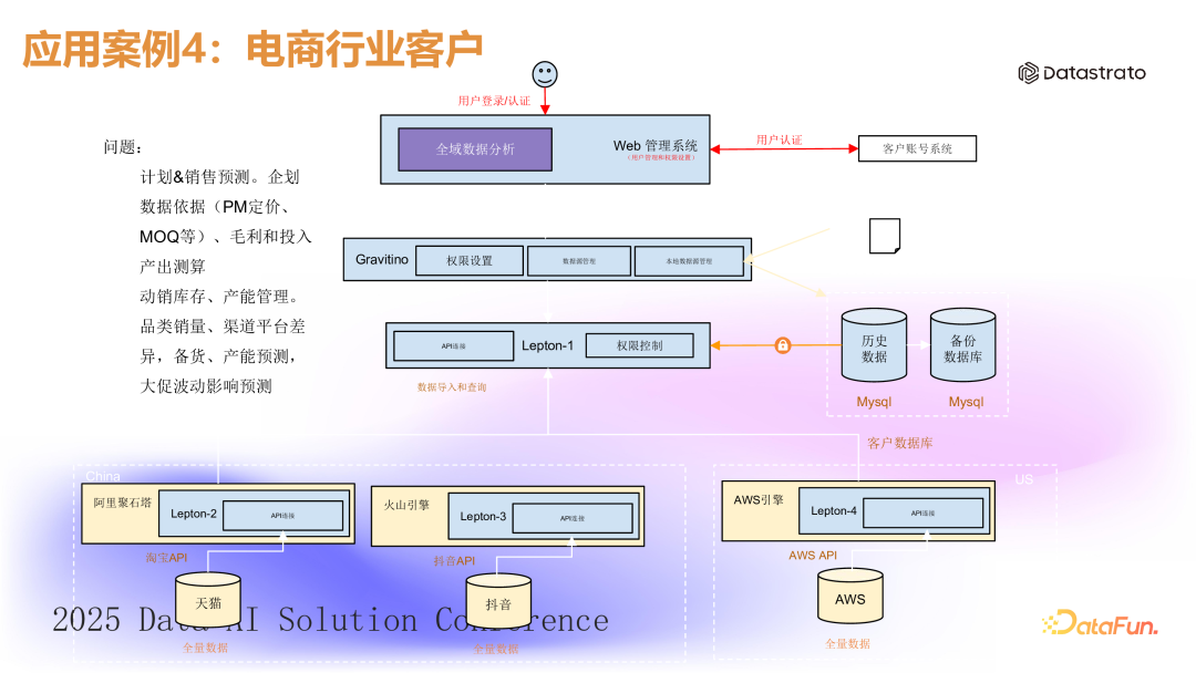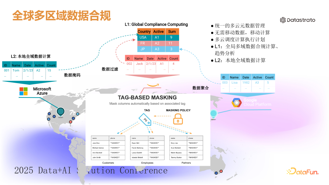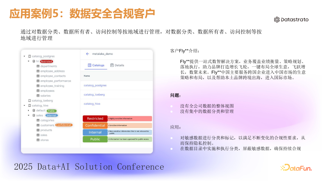 这是一家在多个电商平台销售产品的公司,需要汇总来自淘宝、天猫、抖音和亚马逊等平台的销售数据,以生成全局销售数字和库存数据。然而这些平台的数据彼此割裂,导致分析困难。(1)元数据汇总:首先通过 Gravitino 汇总多平台的元数据,为业务人员提供统一数据资产视图。(2)数据抽取与加工:结合数据虚拟化引擎,每天自动跨平台抽取和加工数据,生成统一的运营报表。5. 案例 5:数据安全合规客户