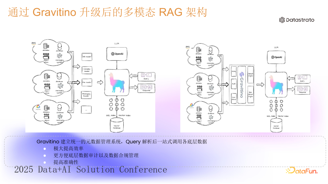 在跨国公司或出海企业中,为了满足不同区域的数据合规要求,数据通常分散存储于多个云服务提供商的不同地区,如国内数据可能存储在阿里云、腾讯云,出海数据可能存储在 AWS、Azure 等。这种分散的模式给企业的数据管理以及汇总分析带来挑战。(1)元信息统一接入:Gravitino 可以将来自不同数据源的元信息集中管理,帮助企业了解各云位置的数据资产。(2)分类分级与敏感信息标注:通过 Gravitino 提供的标签(tag)功能,甚至结合 AI 能力自动标注,对数据进行分类、分级,以标记出个人隐私信息或企业敏感信息。(3)联邦计算与数据虚拟化:利用联邦计算引擎或数据虚拟化技术,在避免敏感信息访问和最小化跨域传输信息的同时,对分散的数据进行统一分析。子引擎可以在不同的数据中心运行,汇总加工结果后返回给上层引擎,从而确保既符合合规要求又提高了开发效率。2. 场景 2:RAG 架构下的多数据源管理