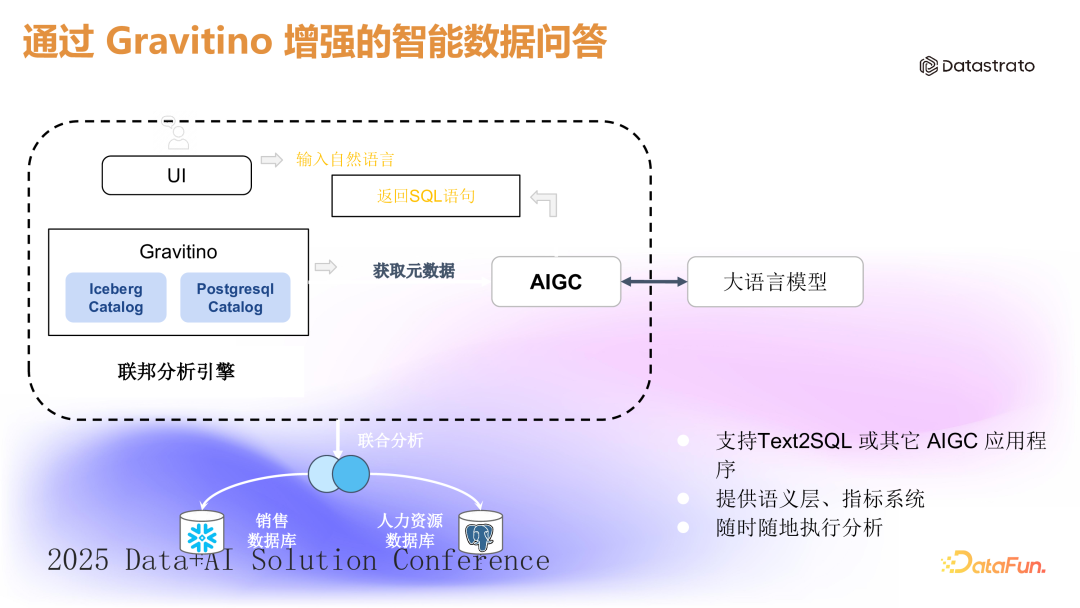 智能问答系统或 Chat BI 应用依赖于大语言模型生成 SQL 查询的能力。然而,企业在实际操作中面临的数据源多样性增加了构建这类系统的难度。(1)数据资产盘点与元信息提供:Gravitino 可以帮助企业盘点内部数据资产,并以统一的方式为大语言模型提供必要的元信息,使得系统可以根据用户的自然语言问题生成准确的 SQL 语句。(2)增强语义信息注册:Gravitino 支持在平台中注册增强的语义信息,如字段的业务含义、血缘、访问权限等。这些信息可以帮助大语言模型更好地理解用户问题,并生成更准确的 SQL 语句。(3)减少对底层系统的侵入性:通过 Gravitino,企业可以减少对底层业务系统的侵入性,同时提供统一的对外服务接口。4. 场景 4:数据工程师和 AI 团队能更高效地协同工作