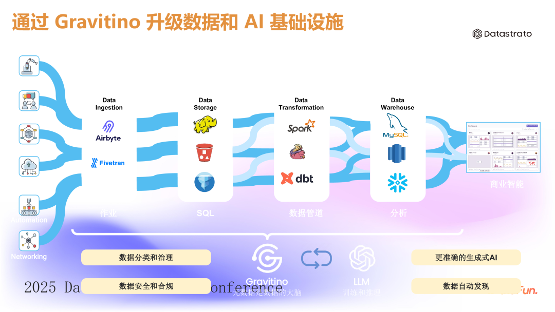 在 RAG (Retrieval-Augmented Generation)架构中,系统需要对接多种类型的企业数据源,如文档库、数据库、数据仓库等。这不仅增加了系统的复杂度,还涉及到权限管控的难题。(1)异构系统统一管理:Gravitino 能够统一纳管各种异构系统,使开发者可以通过单一入口访问所需的各种数据源。(2)简化 RAG 开发:通过统一 SQL 引擎(如 Trino,SparkSQL)屏蔽了结构化数据源的差异,使用 GVFS 虚拟文件系统屏蔽非结构化数据的存储位置差异,从而降低 RAG 系统开发的复杂性。(3)统一记录权限与日志:所有权限管理和数据访问日志都在 Gravitino 中统一记录,便于审查和审计。3. 场景 3:增强智能数据问答