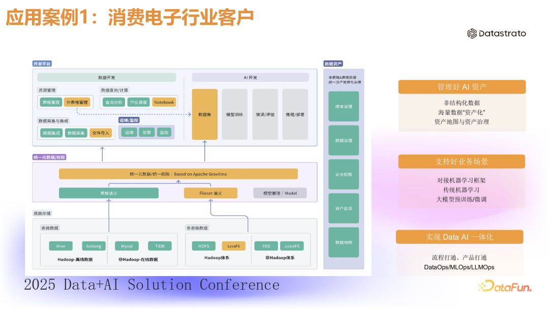 该客户是一家业务形态多样化的消费电子公司,很早就建立了公司层面的统一数据平台来管理其核心数据资产。随着业务扩展和技术进步,尤其是 AI 需求的增长,原有的统一元数据平台已无法满足业务的需求,特别是对非结构化数据管理的需求。(1)统一元数据管理:客户一开始就深入了解统一元数据管理的重要性,其可以帮助快速找到和使用数据,并落实数据权限等治理功能。(2)非结构化数据管理:随着非结构化数据和 AI 需求的增加,客户通过 Gravitino 将 HDFS 、S3 对象存储等非结构化数据统一管理,接入元数据管理平台,实现数据权限的统一管理。(3)在线训练与 AI 开发:通过 Gravitino ,客户实现了数据链路和 AI 训练链路的无缝连接,支持在线训练和 AI 开发,提升了数据管理和 AI 开发的效率。- 实现了数据资产的统一管理,形成了完整的数据资产地图。