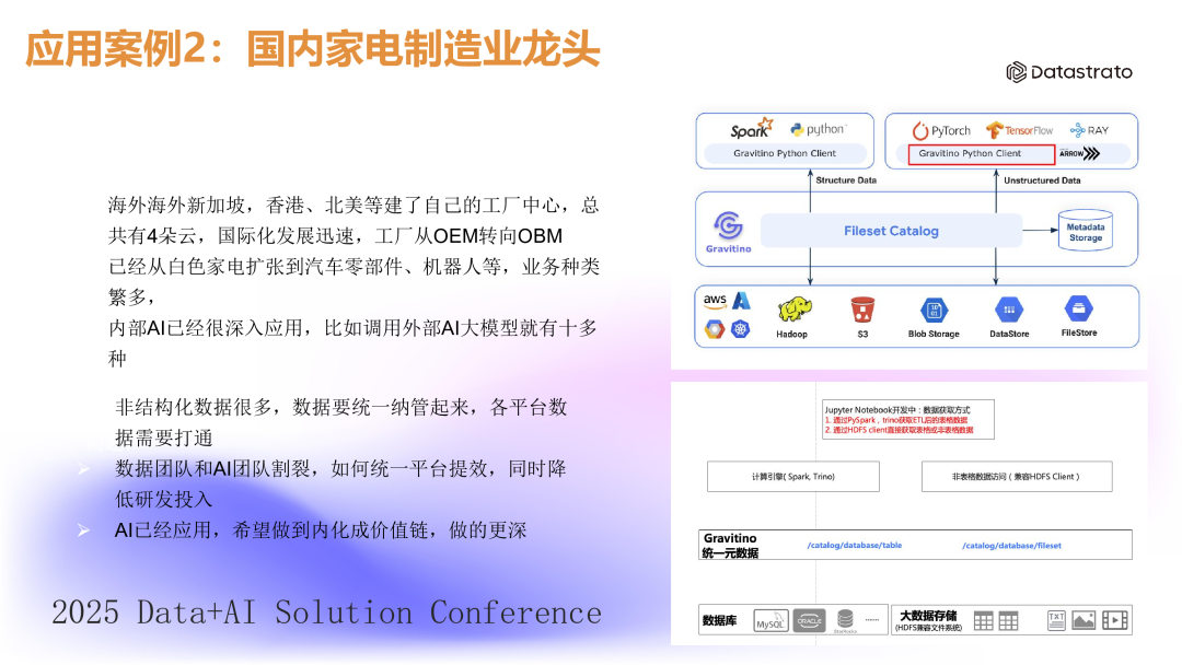 在过去的一年中,Apache Gravitino 获得了众多知名用户的青睐,包括小米、腾讯、哔哩哔哩(B 站)、Flywheel、网易游戏、唯品会、贝壳找房等。这些企业通过采用 Gravitino 来优化其数据管理和 AI 开发流程。1. 案例 1:消费电子行业客户