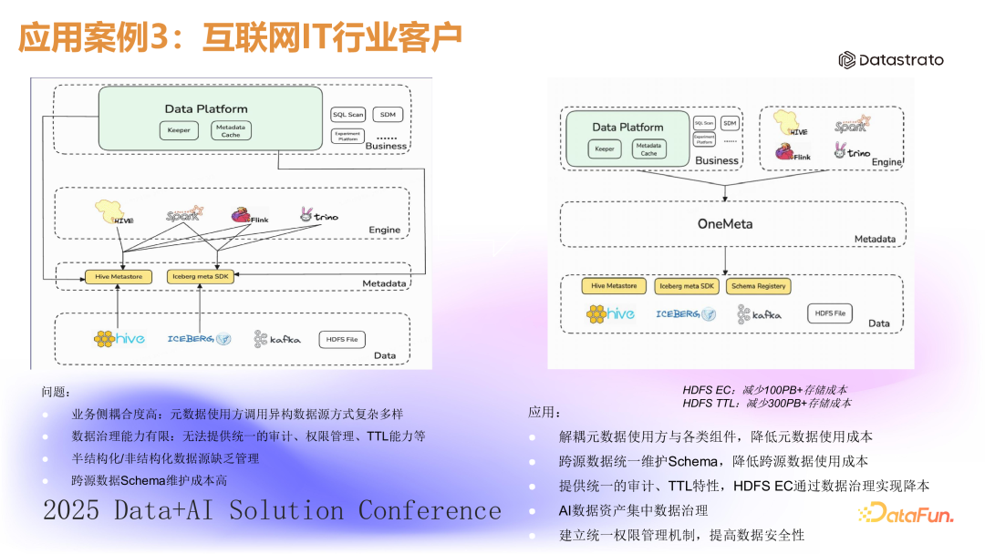 哔哩哔哩是一家内容丰富的互联网公司,拥有庞大的数据体量,并使用多种计算引擎。过去,这些引擎直接访问底层系统的元信息,导致复杂且高耦合的数据访问链路,同时缺乏有效的数据治理手段。具体问题包括:(1)业务侧耦合度高:元数据使用方调用异构数据源方式复杂多样。(2)数据治理能力有限:无法提供统一的审计、权限管理、TTL 能力等。(1)开发 OneMeta 平台:基于 Gravitino 开发 OneMeta 平台,统一管理元数据。(2)简化数据访问:上层引擎通过 OneMeta 访问数据,简化了数据访问链路。(3)数据治理:通过标签和 TTL 等机制,对数据进行分类和治理。- 显著减少了存储成本,例如通过标签和 TTL 策略减少了约 100 PB 的 HDFS EC 存储成本和 300 PB 的 HDFS TTL 存储成本。