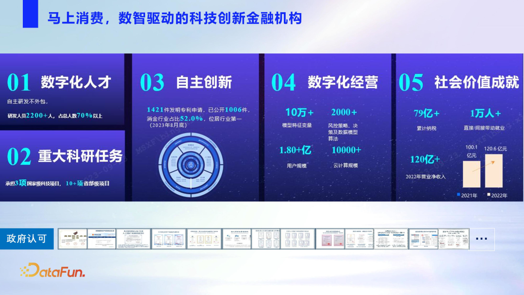 马上消费是一家数智驱动的科技创新金融机构,公司正式员工有 3000+ 人,其中研发人员有 2000+;公司共 1400+ 件专利,已公开 1006 件;目前用户规模已达到 1.8 亿左右。
