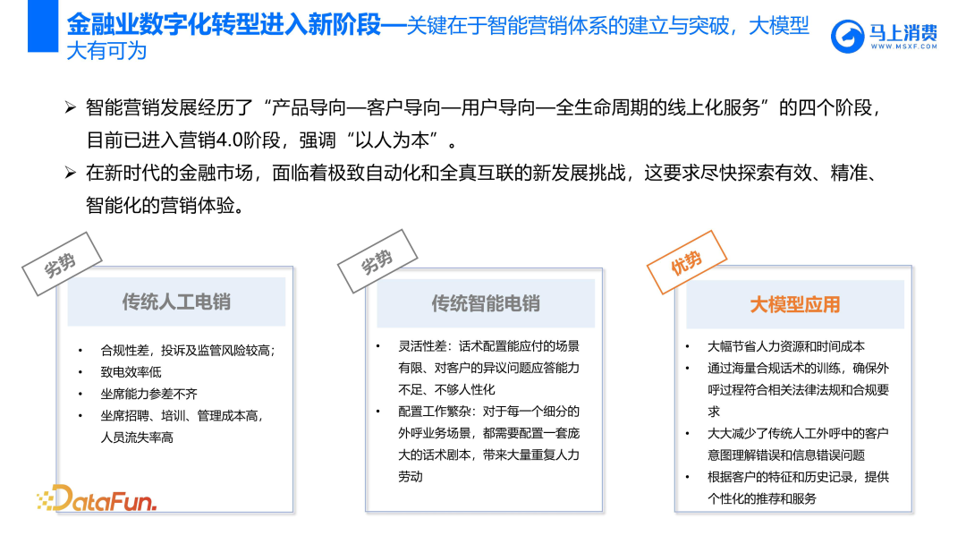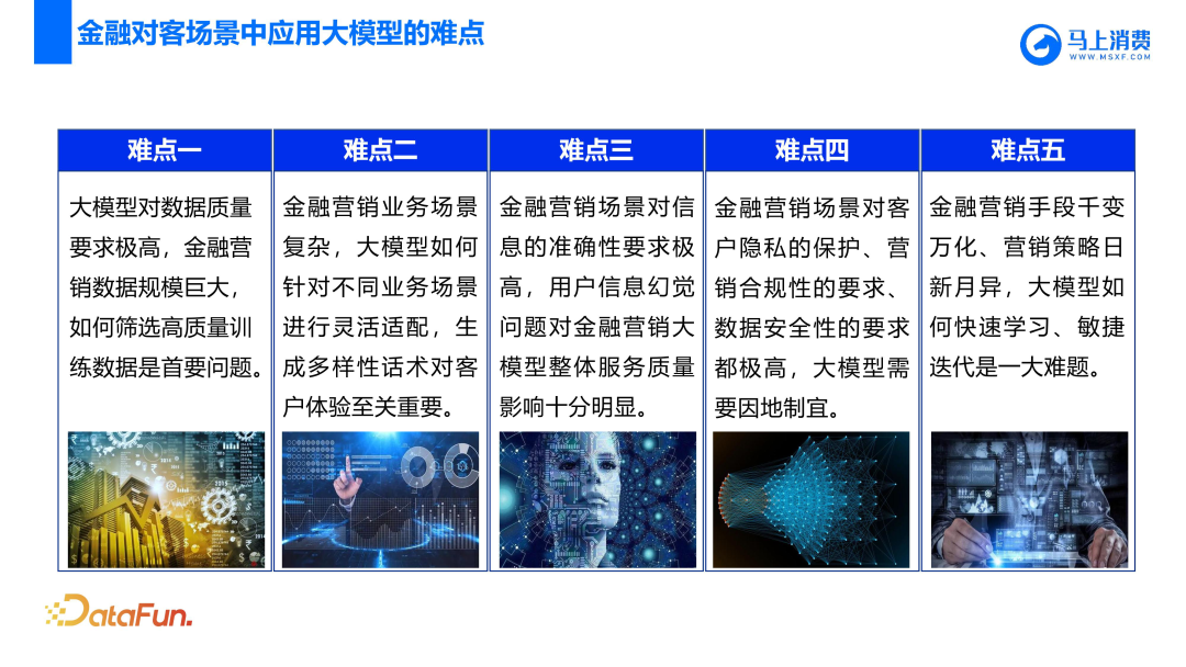 - 难点五:金融营销手段千变万化,营销策略日新月异,大模型敏捷迭代是一大难题。