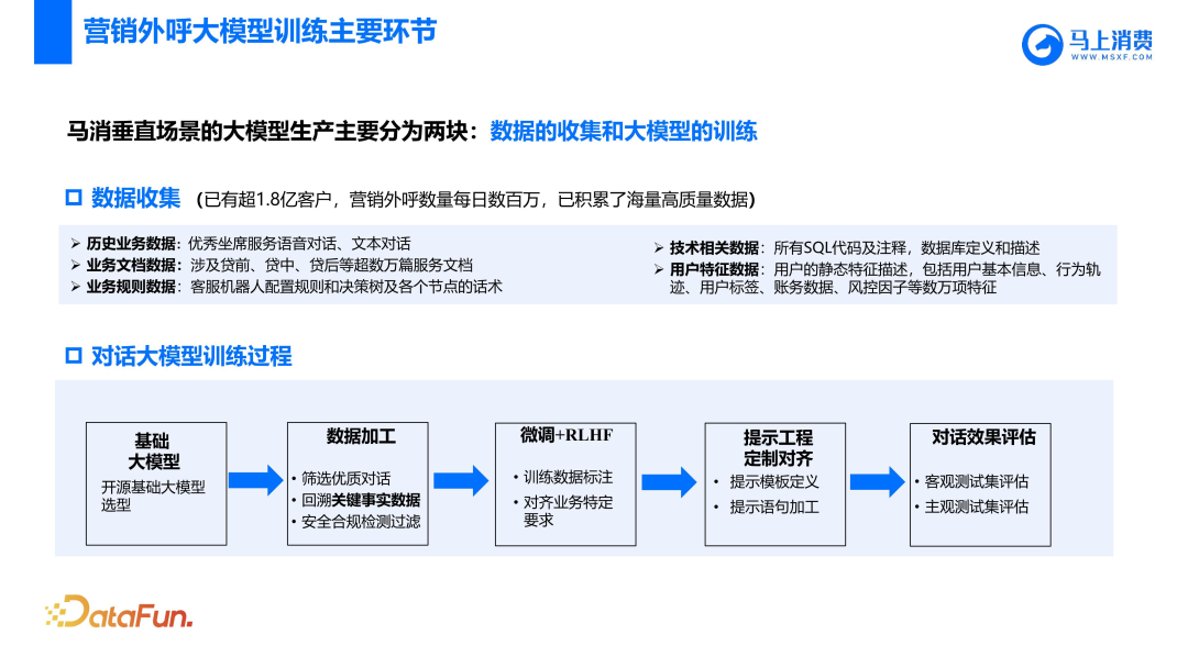 第一类是对话大模型,主要应用于电话销售、催收和客服场景,早期版本使用了中文版的 Chat 模型,后期则换回了英文版本。由于该模型开始较早,所以当时选的是 Colossal+Chat 训练框架,目前营销版模型训练数据是九十万通对话,起初每个 epoch 需要训练 32 小时,最终对推理框架 fast Transformer 进行适配、修改、优化,目前每个 token 可以达到 5.7 毫秒,此外还有一些特殊处理会在后文提及。电销大模型在 6 月份上线,经过几个版本迭代,目前每日有数百万外呼;催收大模型则由于监管要求较高,最终在 9 月份上线;客服大模型是 12 月份上线,应用于客服辅助,其中一些对客子场景也是 12 月份上线。另外马消内部已经上线应用的还包括文档问答大模型和 SQL 生成大模型。文档问答大模型主要应用于知识中台和在线客服的一些智能辅助场景,在知识中台场景中,文档问答大模型用于内部的客服相关文档的管理,例如针对在不同时期文档中相同问题不一致、甚至矛盾的答案的寻找和处理。在智能辅助场景中,文档问答大模型配合传统的智能辅助和大模型对话智能辅助形成一个综合的客服人员智能辅助方案。SQL 生成大模型则主要是解决内部提效问题,因为在马消内部有数十万张表,当一个人在写 SQL 的时候第一个问题可能不是 SQL 难写,而是找不到需要的表,所以 SQL 生成大模型在工业界的实际落地第一步是先去找到这张表,第二步才是生成 SQL。因为今天重点是对话大模型中的营销场景,文档和 SQL 生成大模型就不在此赘述了。2. 马消大模型基础能力建设