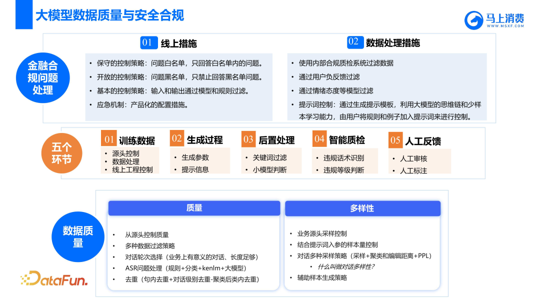 在数据加工中,关键事实数据很重要,比如合同金额、逾期天数等,这些数据大模型不能出错,需要我们准确地告诉大模型。因此,除了完整的优质对话数据外,还需要当天的用户事实数据镜像。如果没有历史事实数据镜像,而选择使用NER、关系抽取等其它推理方式从对话中识别信息可能会带来较高的错误率。合规是金融行业的生命线,数据除了质量外,还需要解决合规问题。合规问题的解决分为线上和线下两步。线上措施比较简单,主要有黑白名单,产品化配置等,比如某个用户说我被电信诈骗了,这个问题不在模型能解决的问题清单里,此时就需要转给人工来处理。处理从源头开始分为五个环节:训练数据、生成过程、后置处理、智能质检、人工反馈。挑选训练数据环节,首先将大模型的对话数据经过内部合规质检系统过滤,再根据用户的负反馈和双方情绪态度模型等从源头过滤不合规的、业务效果不好的训练数据;生成过程环节用生成参数、提示信息等进行控制;后置处理环节用一些关键字和小模型进行过滤;智能质检环节则是将大模型当成一个特殊员工,所生成的对话都经过质检系统进行过滤;但是质检系统往往也不够,比如虽然对话没有违规,但该对话质量不好,或者疑似是负情绪样本等,因此我们还加入了人工审核和标注环节,通过人工不断地迭代调整,确保对话数据质量。数据质量对于大模型效果是关键性因素,微软论文“Textbooks