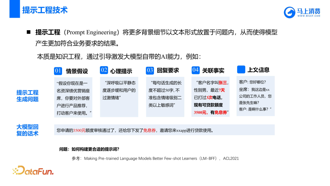提示工程的本质是知识工程,通过引导激发大模型自带的 AI 能力。我们一部分关联事实会用提示的方式构造一些提示词,还有一部分模型容易犯错的重点信息则会用 KV Pair 的方式转化为提示词。对于一些长尾的情况,比如合同个数、合同中的具体金额等信息,由于模型无法生成相应的提示词,我们会以 KV Pair 的形式将其加入提示词中。关于构建合适的提示词,推荐阅读一篇论文“Making Pre-trained Language Models Better Few-shot
