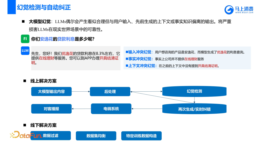在幻觉问题上,需要关注线上和线下的两种情况。例如,将安逸花说成优衣花,在这种情况下,如果用户提出了一个不相关的问题,我们可以通过线上后处理的方式来解决。(1)在提示词中包含相关内容的情况下,对大模型的输出进行识别。例如,如果模型输出提到了提现金额,可以通过算法或规则识别出这是关于提现金额的内容。然后我们可以将提现金额提取出来,并与提示词进行对比,以判断是否一致。(2)在系统启动那一刻无法获取用户相关结构化数据、或者数据量太大无法放入 Prompt 的情况下,通过将模型输出使用传统的 NL2SQL 技术生成 SQL 查询数据库,提取所需的信息,提到信息后该实时纠错就实时纠错,如果无法实时纠错就再次生成,它的生成次数也会限制一次,否则会造成延迟问题,如果一次不行,那这个问题就都可以走兜底话术。然而,需要注意的是,这种方法可能会导致在某些情况下无法提取所需的信息,从而影响模型的性能。因此,在实际应用中,我们需要仔细考虑这种方法的适用性,并根据实际情况进行调整。关于幻觉产生的原因,其中一个原因是不正确的数据。例如,用户可能认为他们之前联系过,但实际上并没有。为了解决这个问题,可以在提示词中加入昨天联系的信息。如果提示词中无法加入,那么可以在数据中去掉这个信息,以保持数据的均衡。再比如,在实际应用中,我们发现当业务侧提出疫情相关问题时,模型可能会胡乱回答。这是因为模型没有见过这种数据,所以无法给出准确的回答。为了解决这个问题,我们可以通过增加训练数据来改善模型的表现。