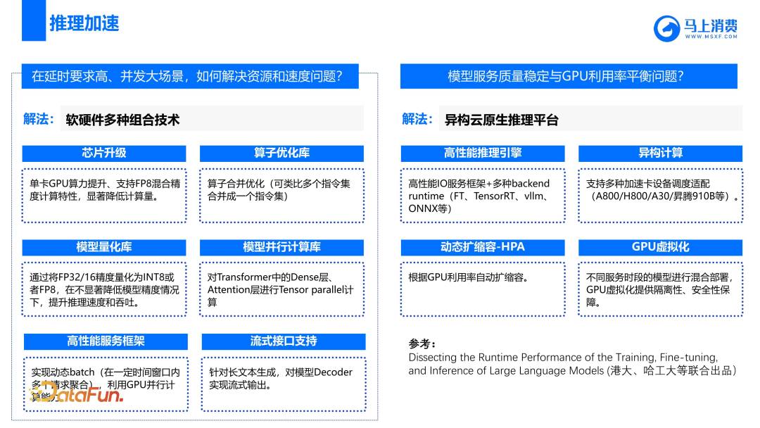 在推理加速方面,我们采用了基于快速 Transformer 的方法,并通过算子融合等优化技术来提高模型的性能。这些技术可以帮助模型更快地处理问题,提高整体性能。推荐一篇新出的论文“Dissecting the Runtime