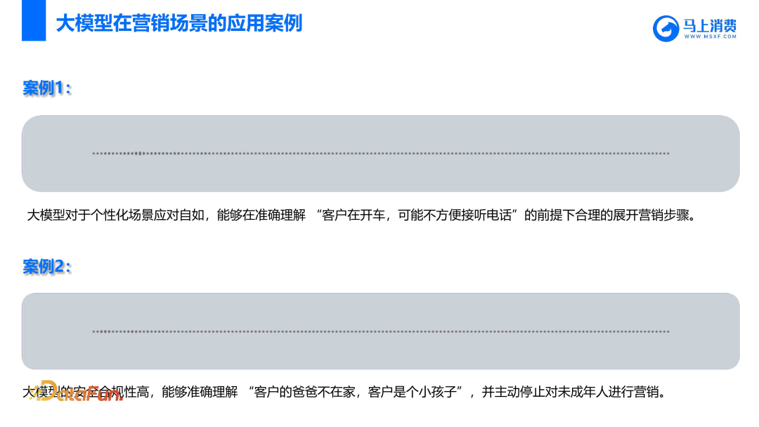 案例一:大模型对于个性化场景应对自如,能够在准确理解“客户在开车,可能不方便接听电话”的前提下合理的展开营销步骤:大模型:“诶,您好,请问这边是冯先生吗?”