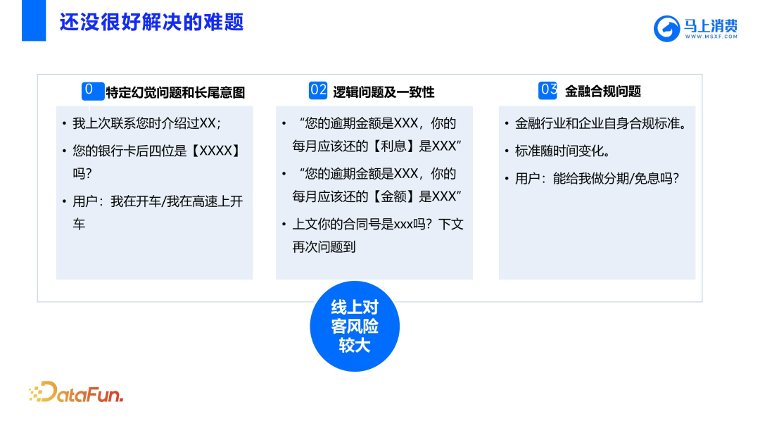 - 提示入参幻觉问题,比如上次联系过您介绍过 xxx,其实并没有介绍过。长尾意图,比如开车意图可能 99% 是说开车,但也有 1% 是在说高速,这个 1% 就可能无法很好地识别出来。