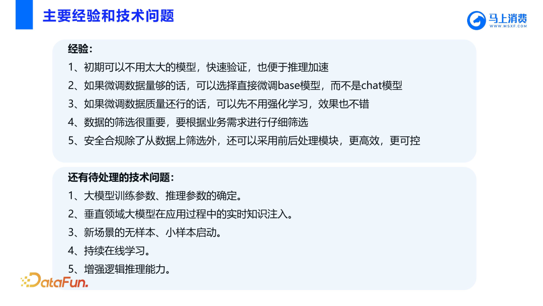 模型初期可使用 base 模型快速验证,若数据量足够且质量良好,也可以不使用强化学习。强化学习是解决业务的特定要求,如果特定要求的训练数据足够,就不需要强化学习;而如果特定要求的训练数据不足,人工标注仍有一定实用价值,这个时候强化学习还是有用的。还有些待处理的技术问题包括,参数和推理参数确定,因为参数的训练成本太高了,人工评测一次成本也很高,虽然也经过一些粗略的测试,但是目前最佳参数还是不能很好地评估。实时知识注入也是一个问题,假如新来了一个入参怎么办?新场景无样本、小样本启动、持续学习以及增强逻辑推理能力等都是下一步要解决的问题。