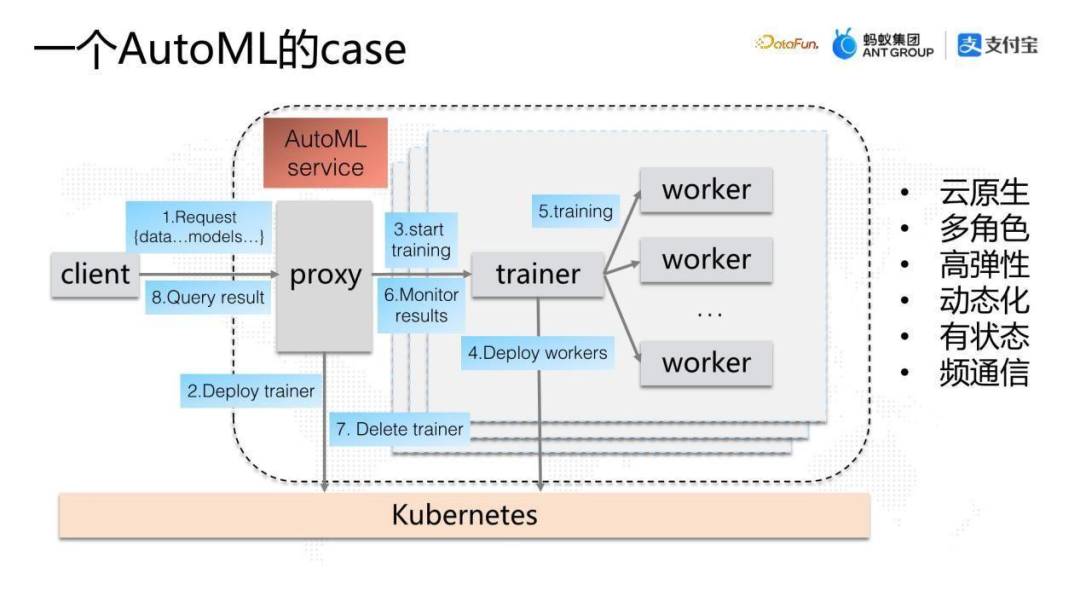 这是一个比较完整的AutoML Service服务,可以看到其特点为:云原生、多角色、高弹性、动态化、有状态、频通信。高弹性主要体现在proxy和trainer两个角色中,他们都会在runtime的过程中不断地去申请资源。