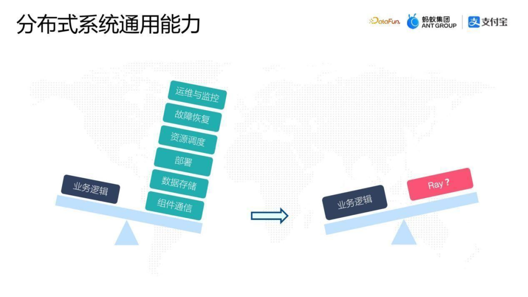 我们可以看到整个云原生环境下分布式系统的构建是非常复杂的。但是经过分析可以看到,很多需要研发和维护的逻辑是通用的分布式系统的逻辑,跟实际的业务逻辑没有直接的关系。比如上面提到的AutoML的case,业务或者系统的开发同学更关注AutoML本身的逻辑。那么,是否有一个系统,能够将分布式系统的通用能力全部解决,使得系统或者业务的研发团队能够专注于业务逻辑本身呢?Ray的出现就是为了解决这个问题。