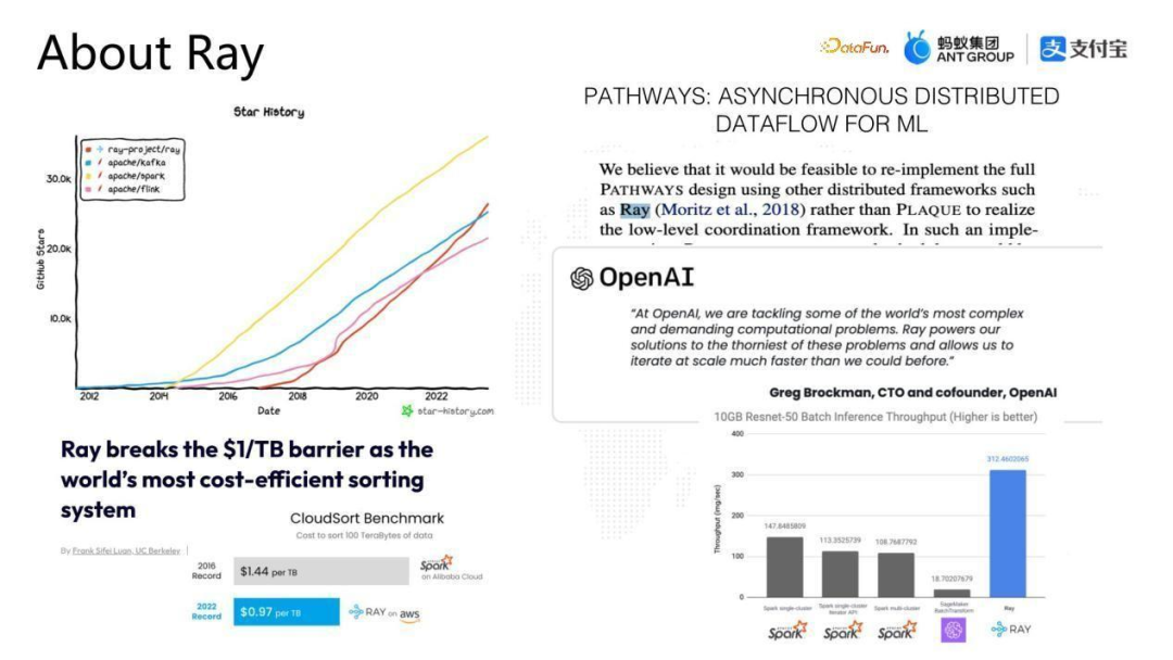 右中是最近被大家熟知的大语言模型公司OpenAI的信息,OpenAI在今年公开了GPT3.5和GPT4的分布式训练的部分细节,底层也是通过Ray来构建整个分布式系统的。