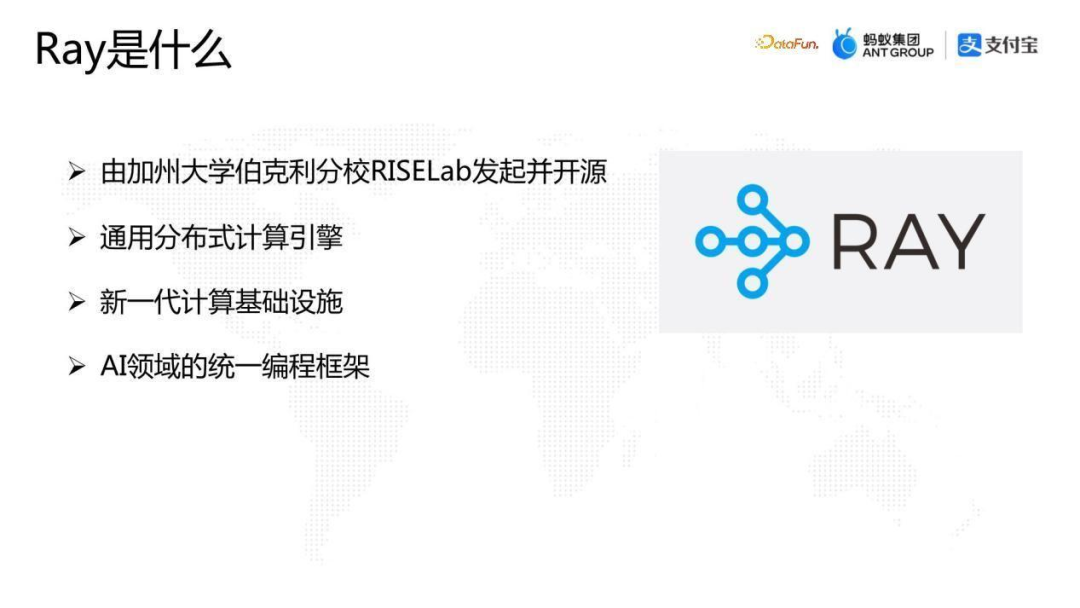 右上是一张 Google 的PATHWAYS论文的截图,PATHWAYS在 Google 内部实际被看作是下一代 AI 的基础架构,在这篇论文中多次提到了Ray,认为Ray实际上非常有可能成为该基础架构中的分布式计算框架。
