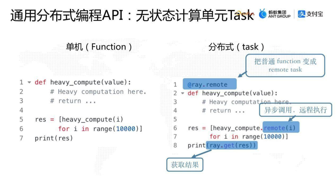 具体如何分布式化?我们在单机编程中经常用到两个非常核心的概念,一个叫Function,一个叫Class,在面性对象的编程语言里面,基本上大家会围绕这两个概念进行代码开发,在Ray中会将这两个基本概念进行分布式化,对应到分布式系统就叫Task和Actor。