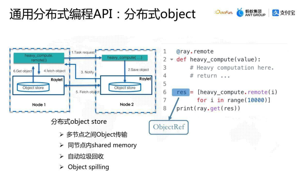 下面看一下Ray中object的概念。讲object的原因是想让大家理解一下为什么Ray可以把heavy_compute Function运行到另外一个节点并且可以把结果拿回来,这依赖于Ray底层的分布式object store。整体流程如上图左侧所示。