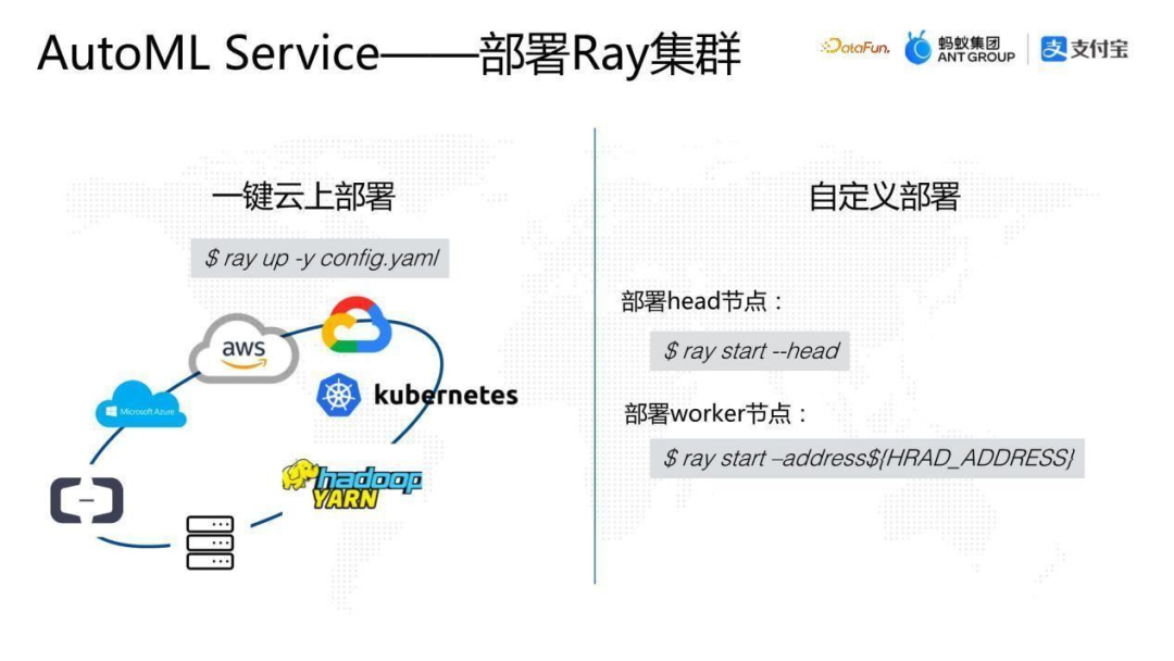 第二种是自定义部署,如果是非标环境,则需要自定义部署,可以使用 ray start 命令分别启动head节点和worker节点,完成手动的组网。