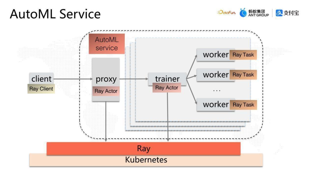 有了Ray集群以后,我们回到之前AutoML的架构图,这里已经加入了Ray系统,利用Kubernetes+Ray,如何实现这个分布式系统呢?