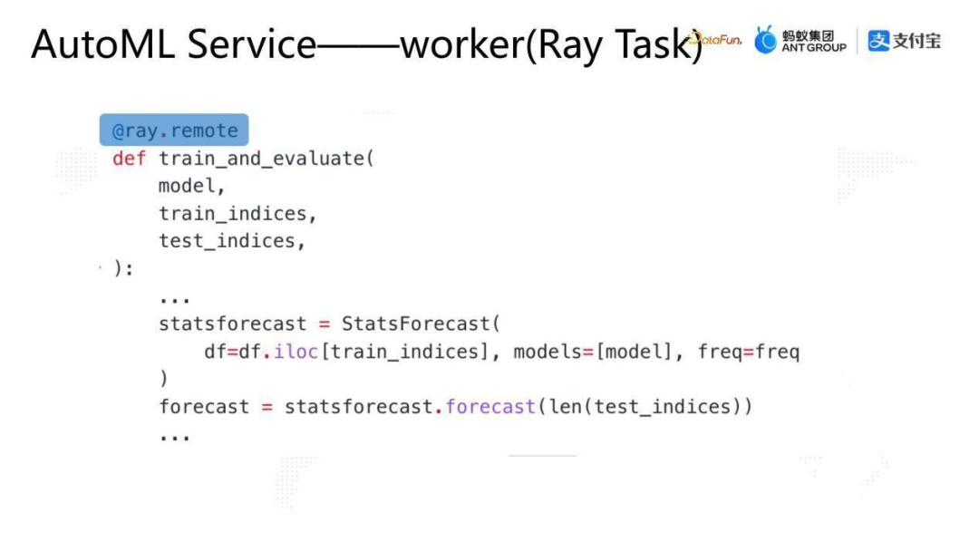worker是一个Task,所以需要封装一个function。function train_and_evaluate的主要逻辑是拿到model、训练数据集和测试数据集,完成单机的训练和评估,上面是已经抽象成单机的计算。然后通过ray.remote 把它变成一个Task。