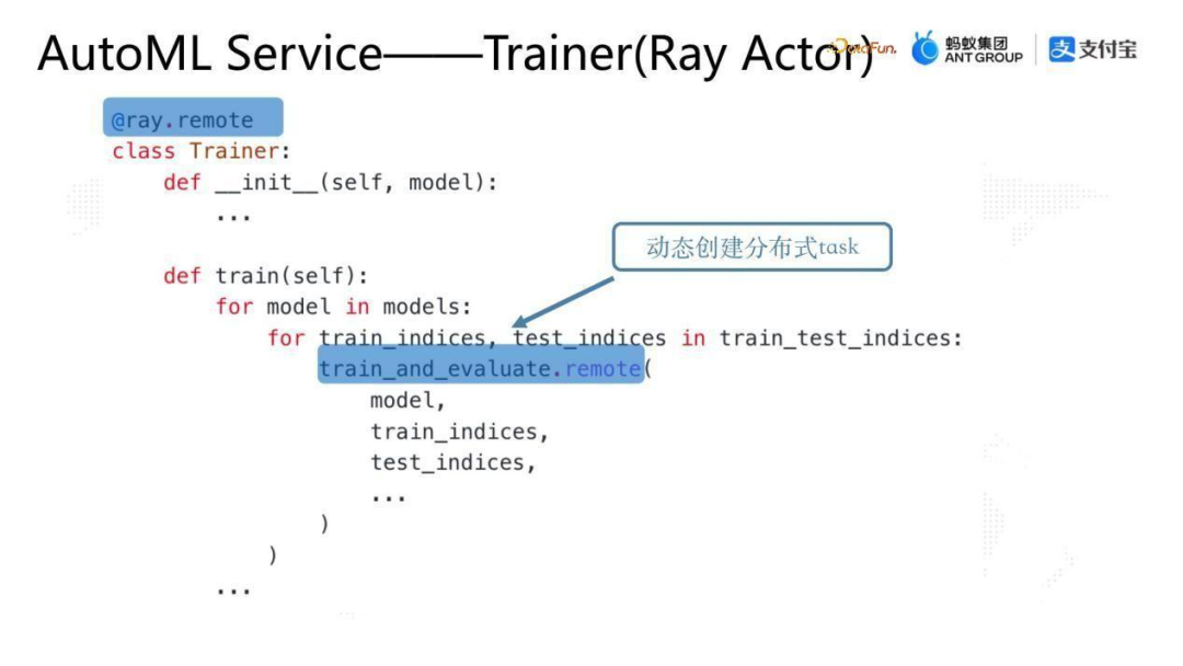 一个是do_auto_ml,用户的请求调度到该function上会触发部署一个Trainer的Actor,然后再调用该Actor 的 train方法来触发整个AutoML的计算;