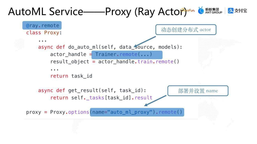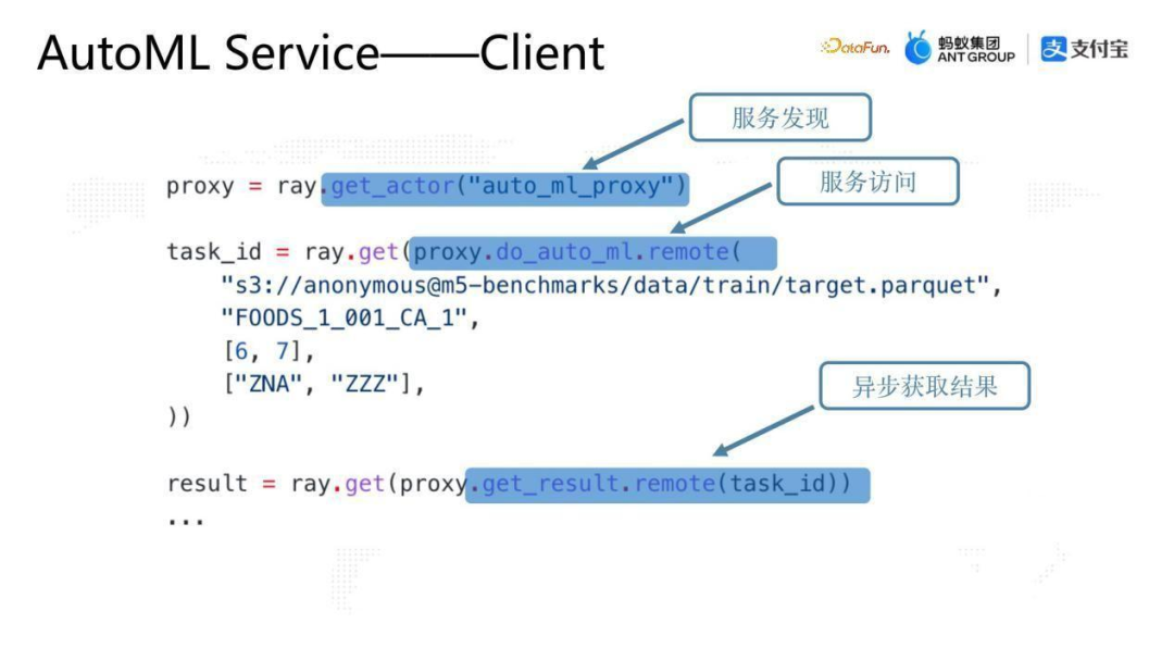 用Ray Client 接入的时候,任何一个AutoML用户拿到Client,先通过ray.get_actor传入上面的actor name就可以获得proxy的句柄,然后可以通过proxy的句柄调用proxy方法从而实现AutoML的接入,最后通过调用proxy 的get_result拿到最终的运算结果。