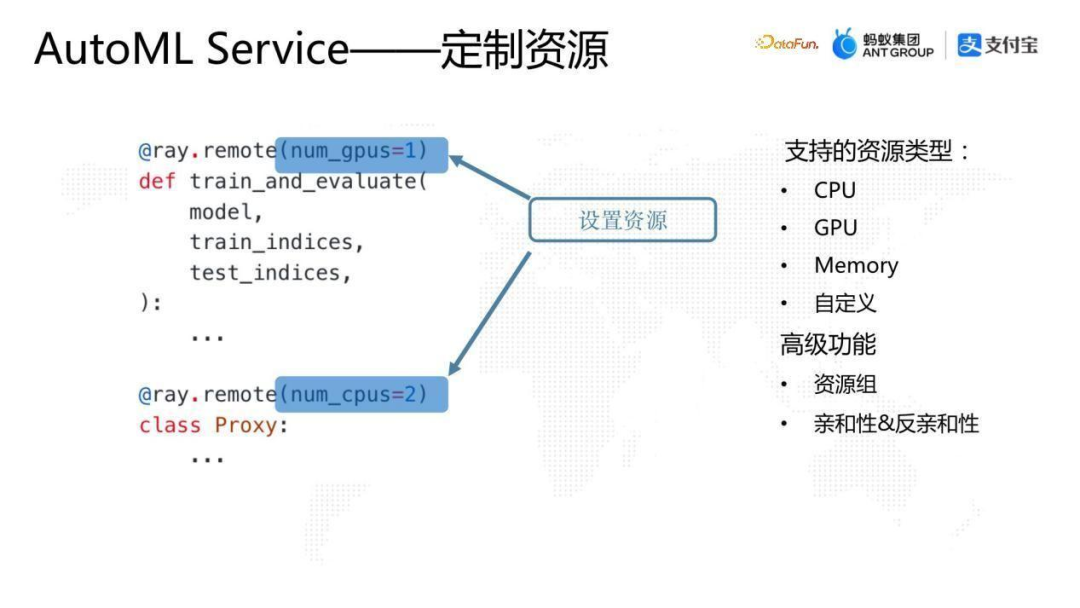 Ray的资源定制除了支持GPU、CPU、Memory 之外,还可以插入自定义资源。然后Ray的调度还有一些高级功能,比如资源组,或者亲和性和反亲和性的调度,目前都是支持的。