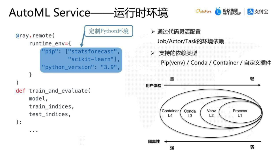 右下图从运行时环境这个角度看,以Python为例,隔离性的支持力度有如下几个维度,一个是 Process 级别的隔离,第二是 Virtual env 级别的隔离,第三是 Conda 级别的隔离,最后是 Container级别隔离。
