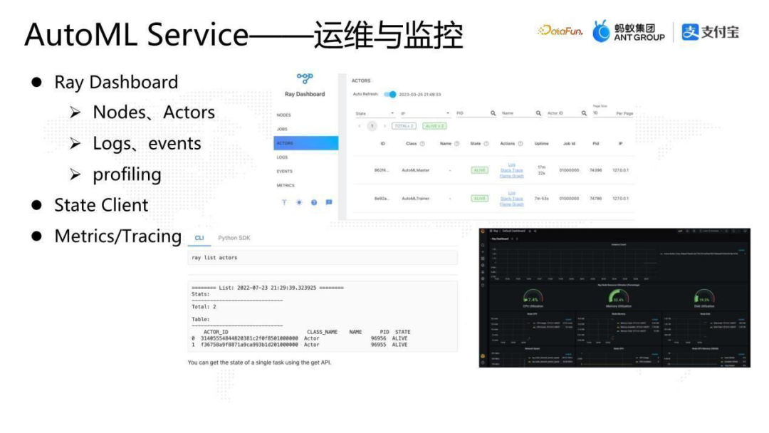 Ray提供了 Ray Dashboard。Ray dashboard实现了整个Ray集群包括Ray Nodes、Ray Actors等各种维度信息的透出;另外,还有集群内的Logs和events,比如某个Actor的某个方法执行异常,Ray会把堆栈通过 event收集到dashboard中,方便迅速定位问题;除此之外还有profiling 工具,Ray dashboard 可以支火焰图,还可以一键看到任意一个Actor或Task的进程状态或者堆栈。